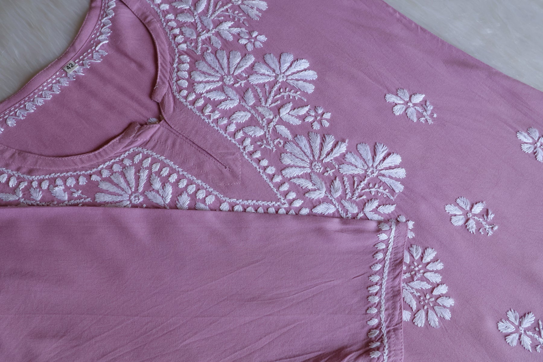 Lavender Short Rayon top with chikankari handwork in Paisley and Floral pattern. It's a really Stylish top with beautiful details and comfort!