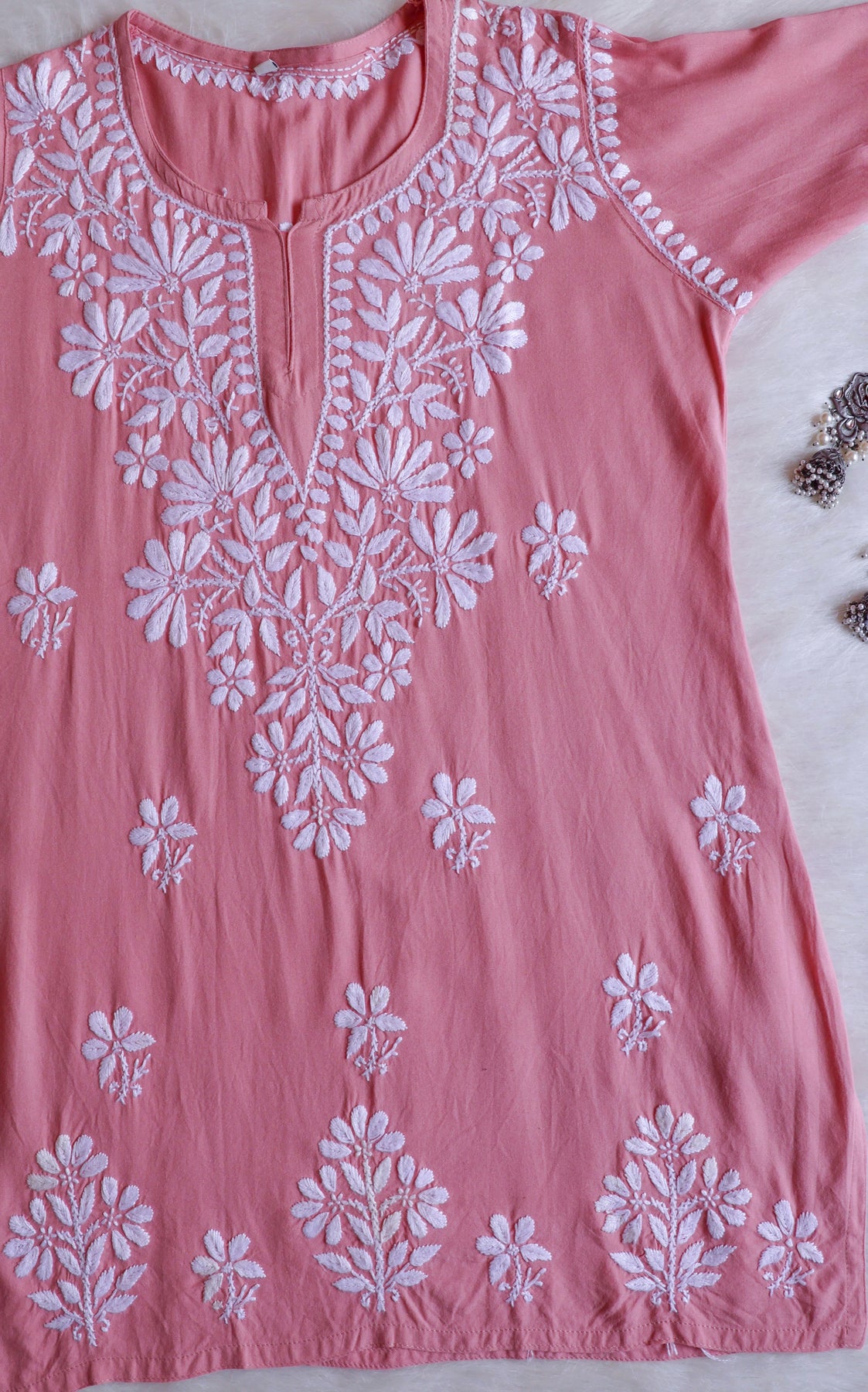 Rose Brown Short Rayon top with chikankari handwork in Paisley and Floral pattern. It's a really Stylish top with beautiful details and comfort!