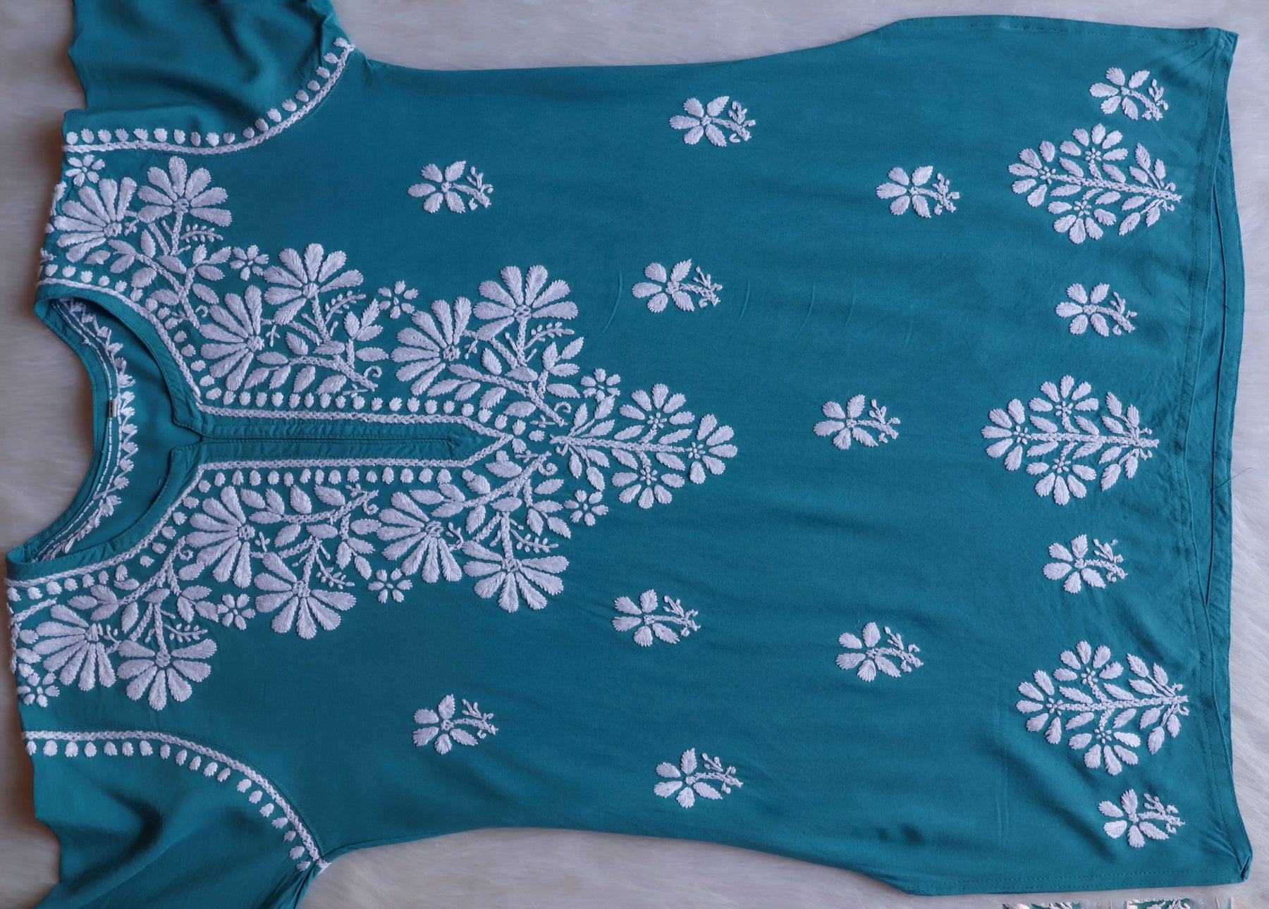 Ocean Blue Short Rayon top with chikankari handwork in Paisley and Floral pattern. It's a really Stylish top with beautiful details and comfort!