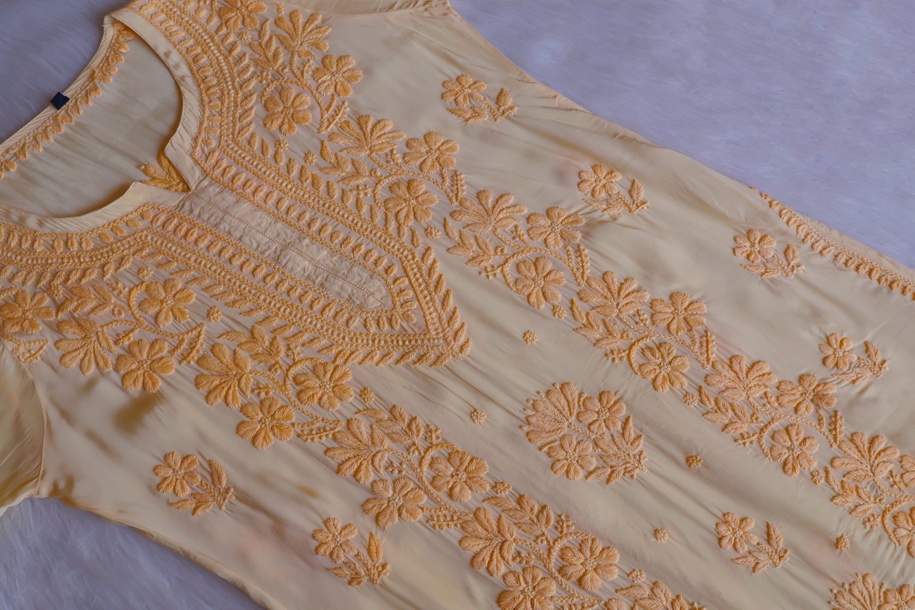 Yellow long pure Viscose Georgette kurta with chikankari handwork in Leaf and Floral intricate pattern on the kurta.