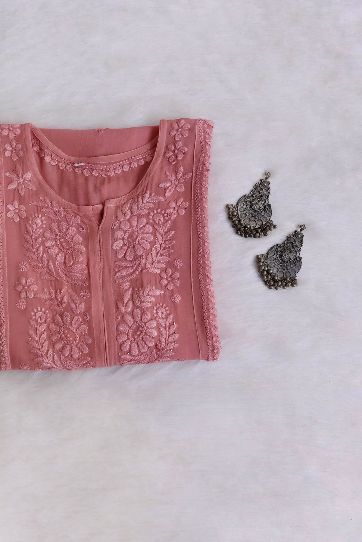 Rose Brown long pure Viscose Georgette kurta with chikankari handwork in Leaf and Floral intricate pattern with Mukaish embellishments on the kurta.