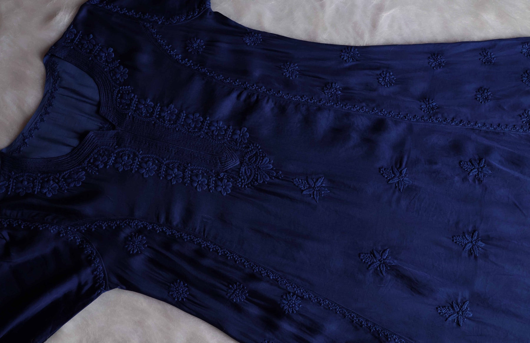 Royal Blue Silk A-line dress with chikankari handwork in Paisley and Floral pattern. It's a really Serene piece from our Silk premium collection with beautiful details! It's perfect and is made for everyone.