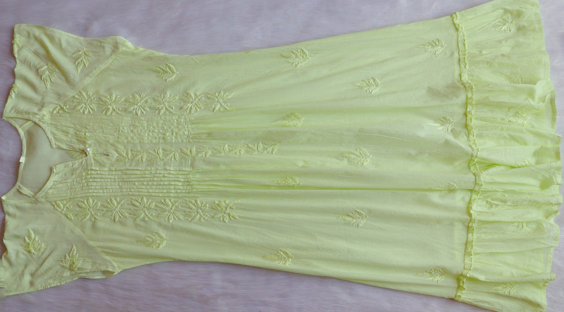 Lime Green Pure cotton midi dress with chikankari handwork in Paisley and Floral pattern with beautiful pintex details and pearl button on the neck to elevate the look.