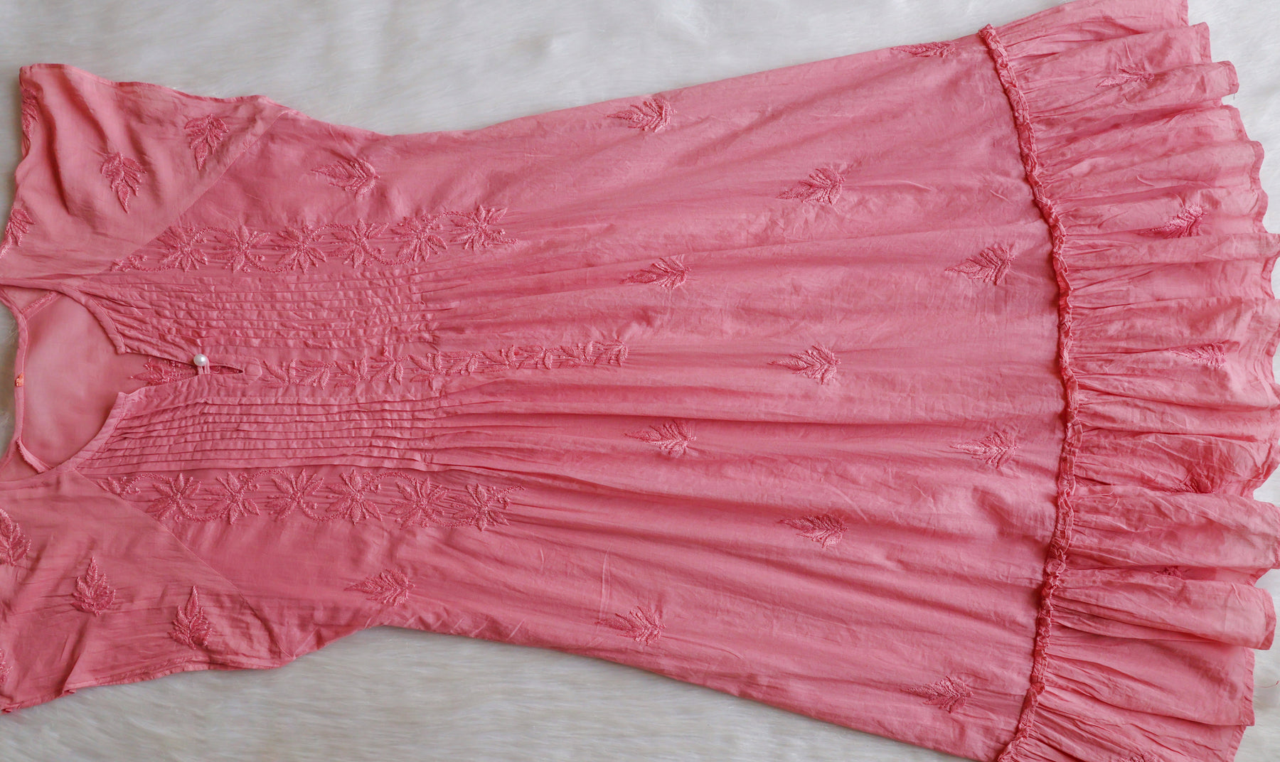 Rose Brown Pure cotton midi dress with chikankari handwork in Paisley and Floral pattern with beautiful pintex details and pearl button on the neck to elevate the look.