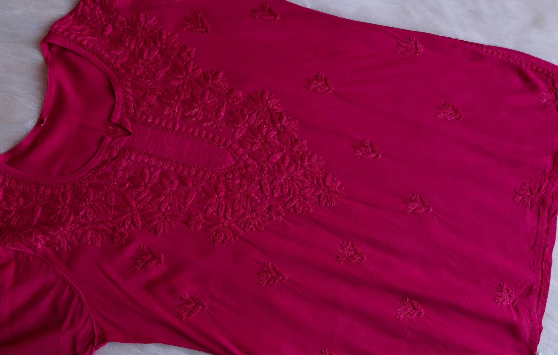 Deep Pink short Rayon top with chikankari handwork in Paisley and Floral pattern. It's a really Stylish top with beautiful details and comfort!