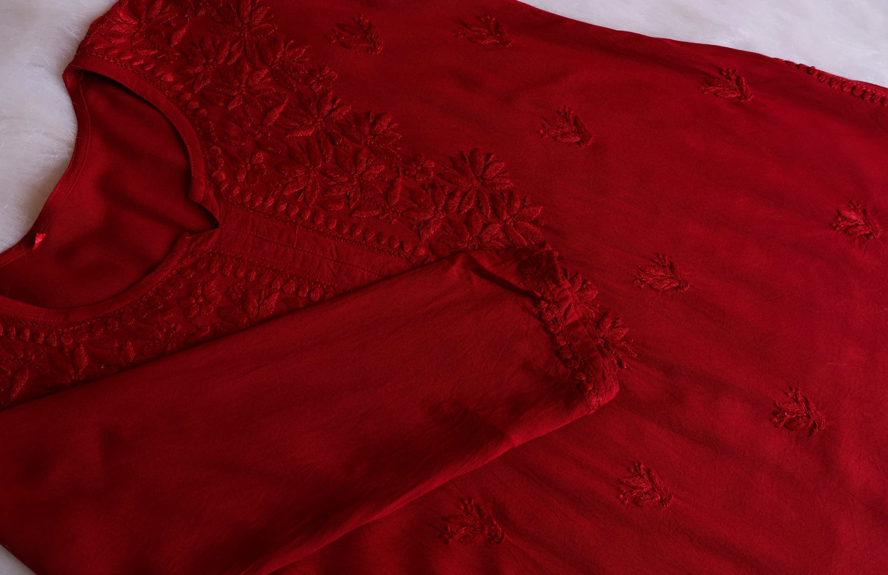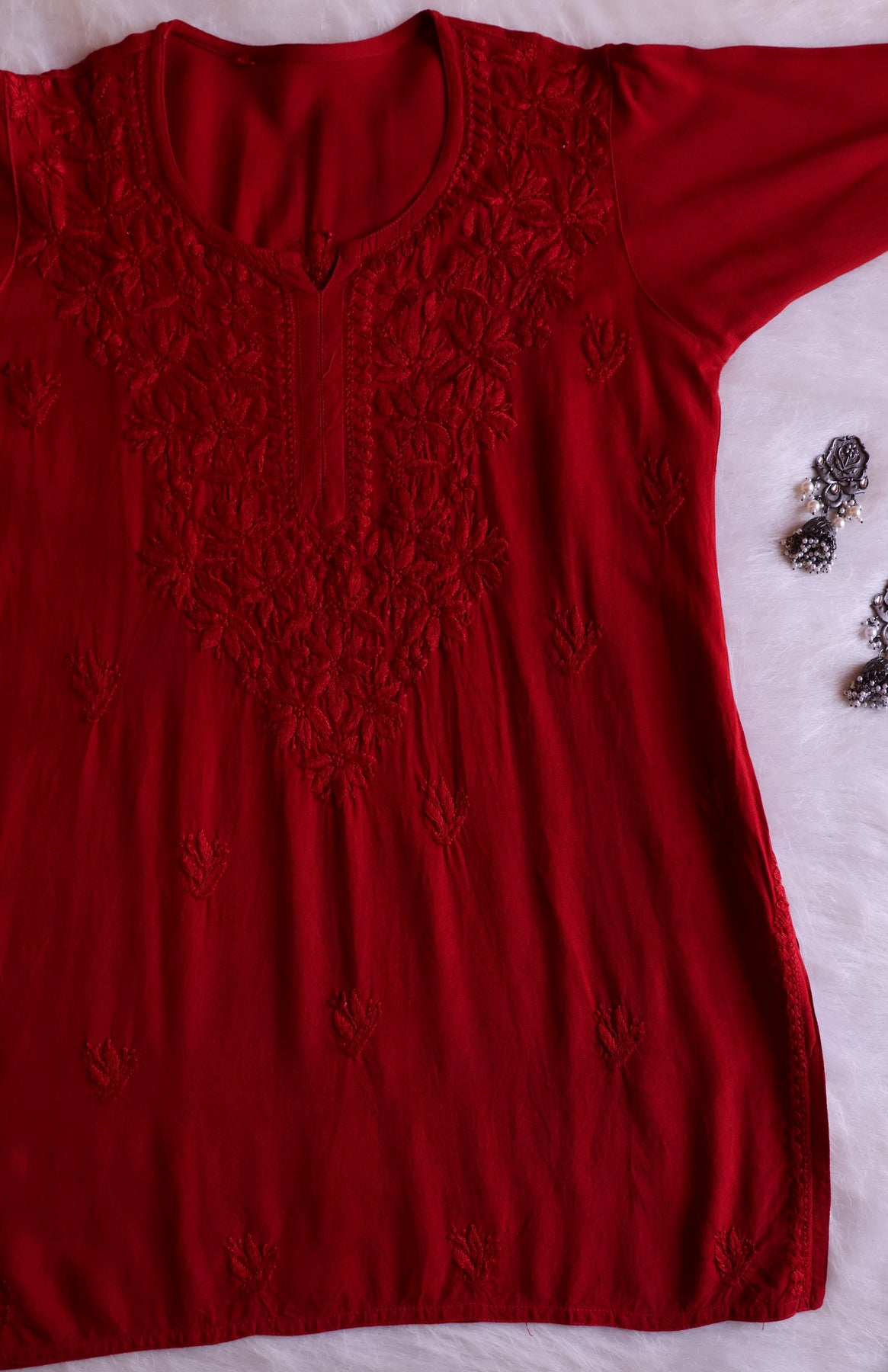Maroon short Rayon top with chikankari handwork in Paisley and Floral pattern. It's a really Stylish top with beautiful details and comfort!