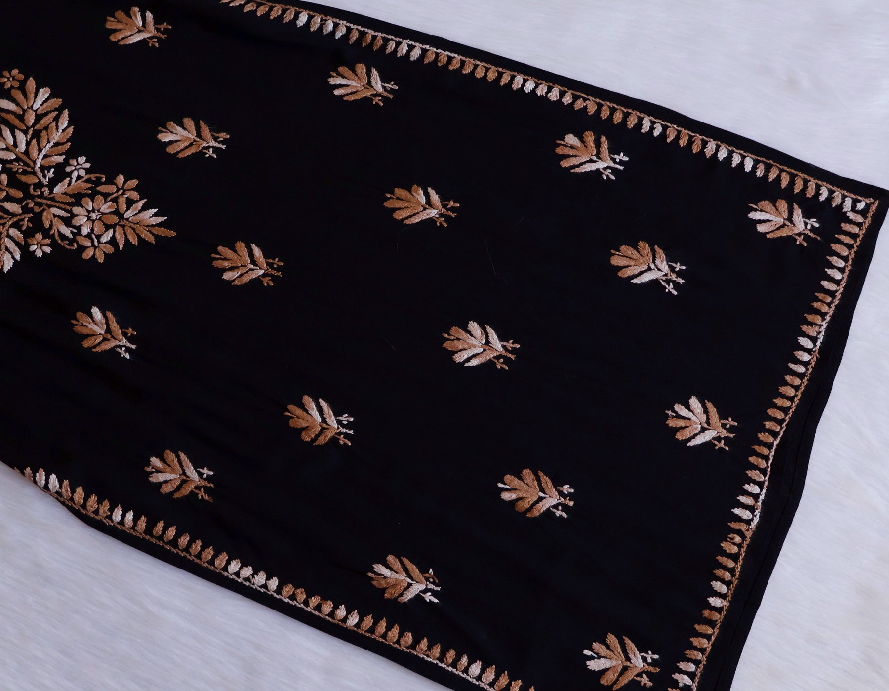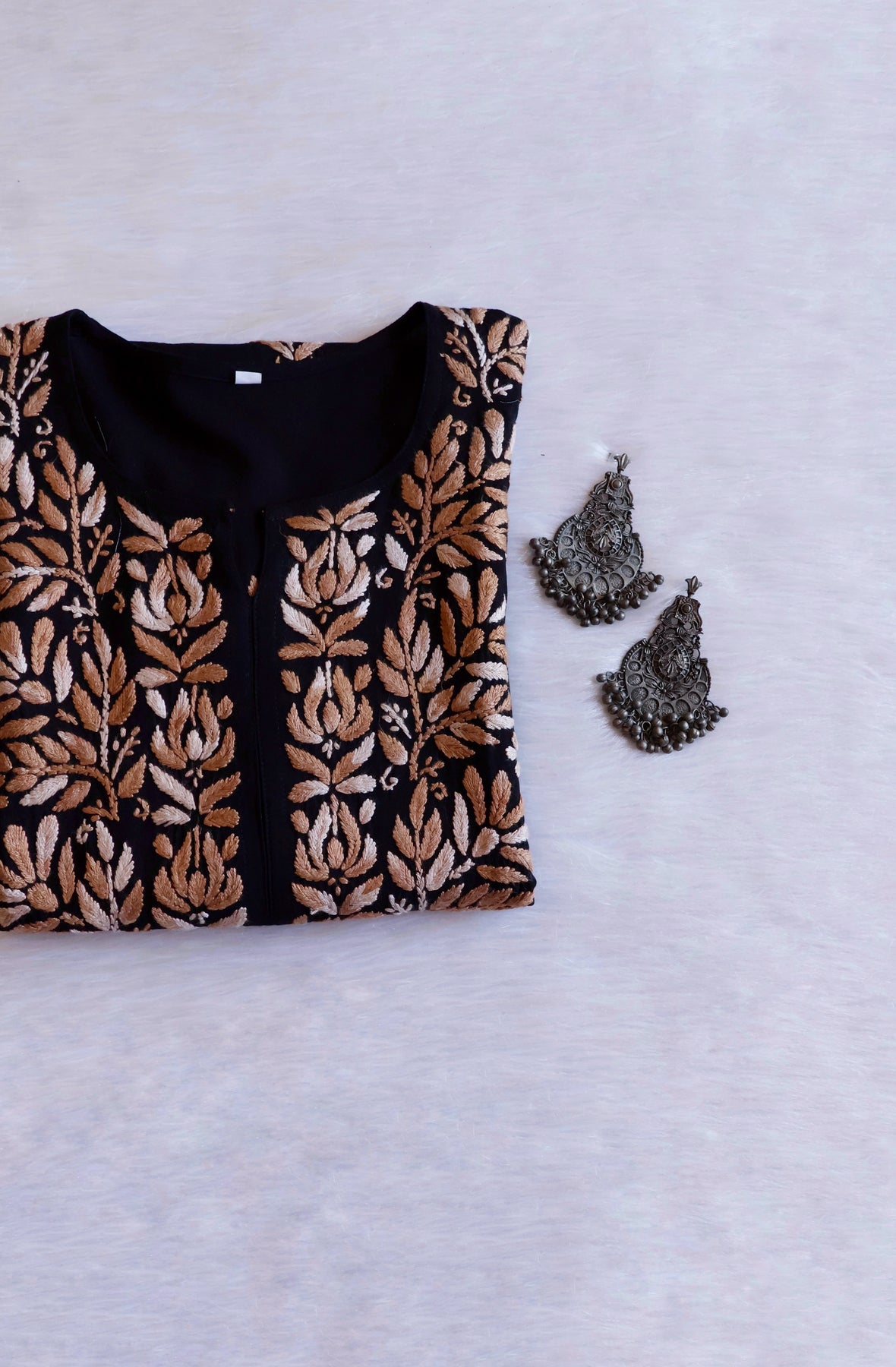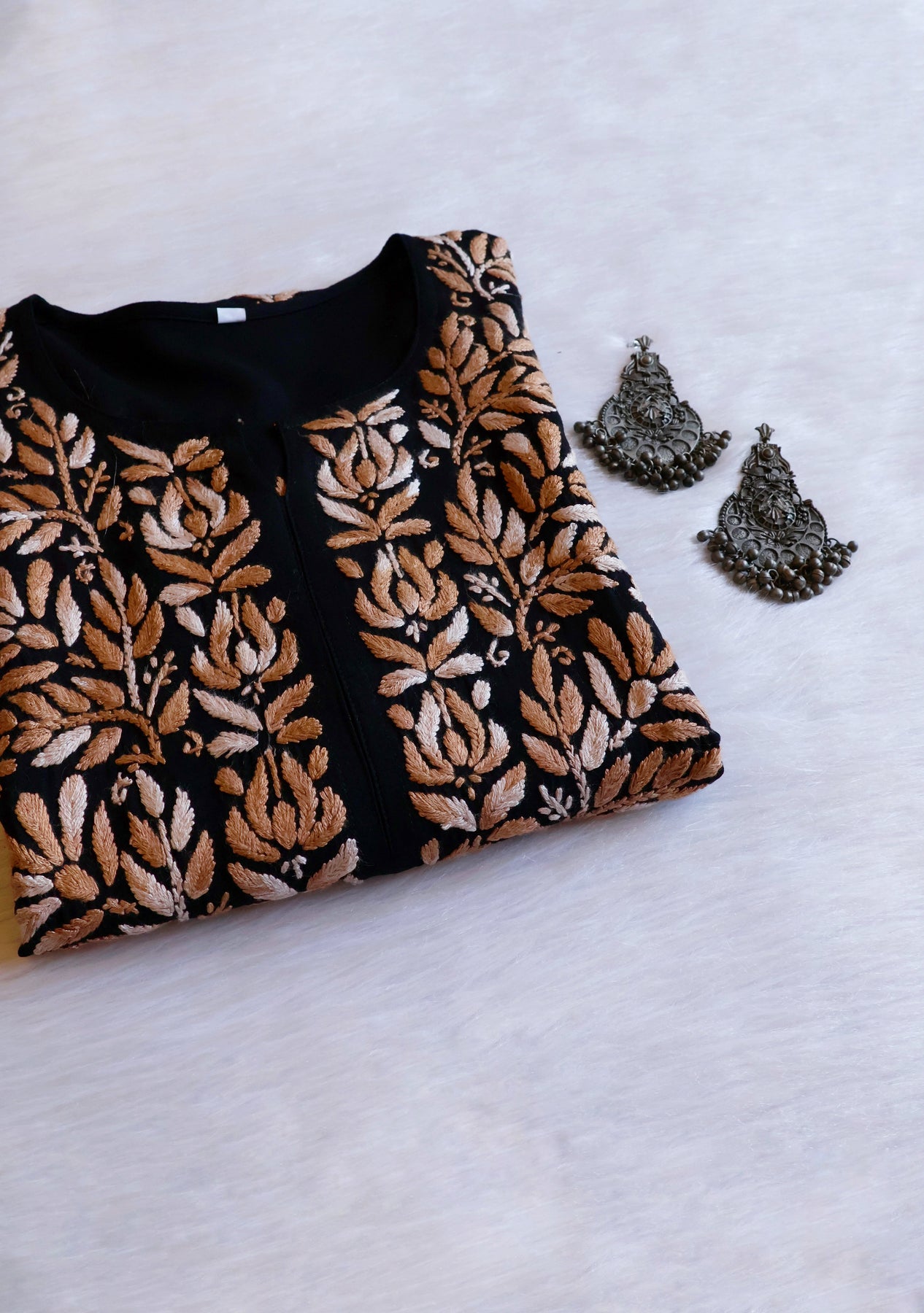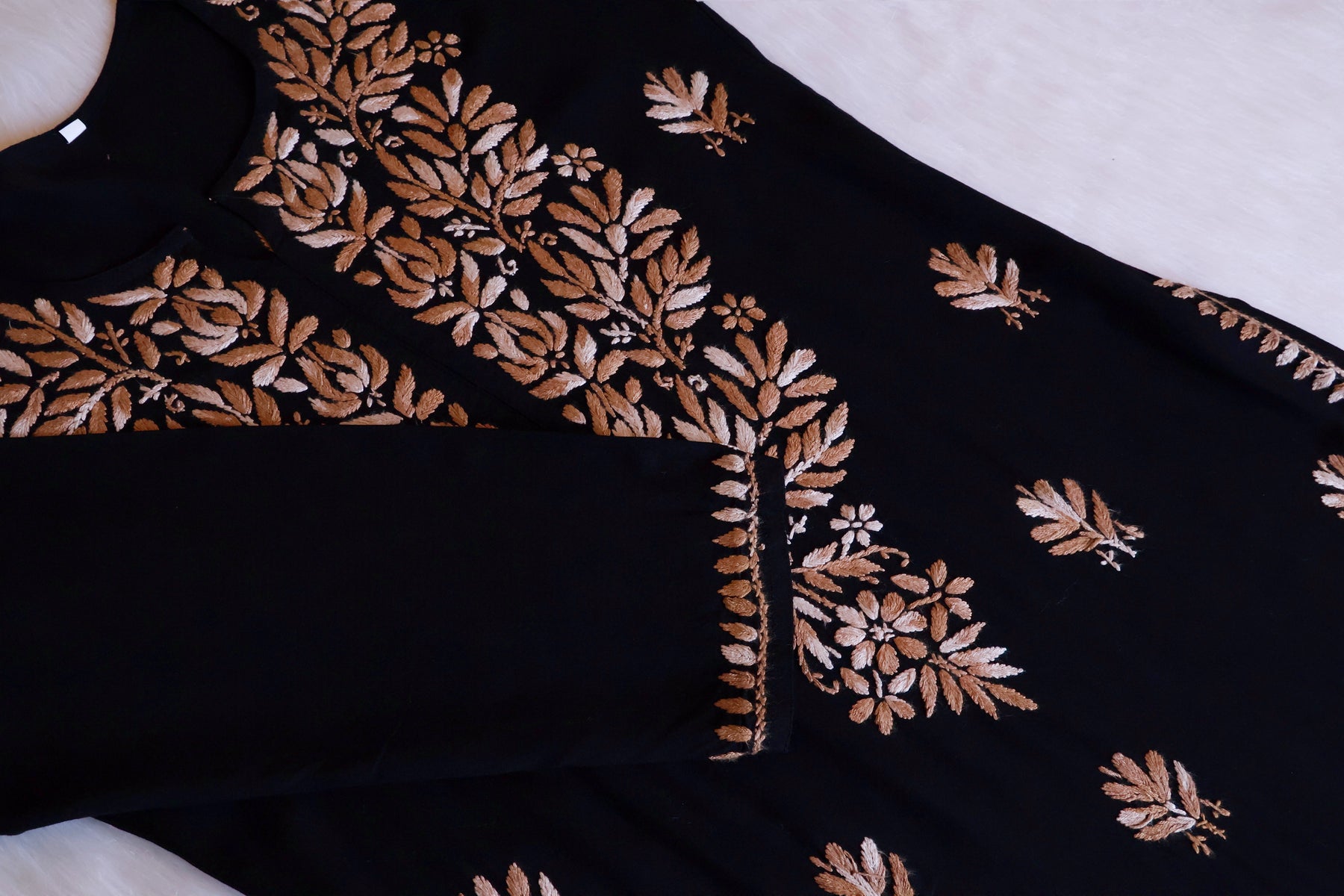 Black Ombre Long Rayon top with chikankari handwork in Paisley and Floral pattern. It's a really Stylish top with beautiful details and comfort!