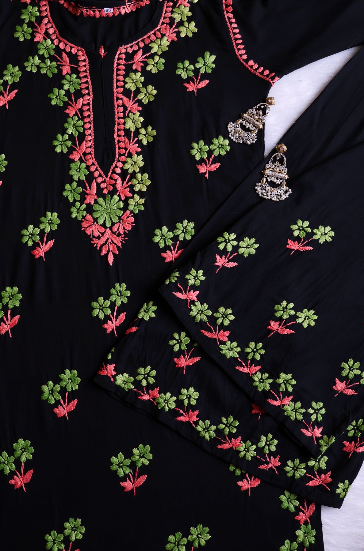 Black Long rayon kurta with chikankari handwork in Rose and Floral pattern with Multicolored ombre thread paired with a matching Rayon palazzo. It's the perfect kurta set for winter with beautiful Floral details and comfort!