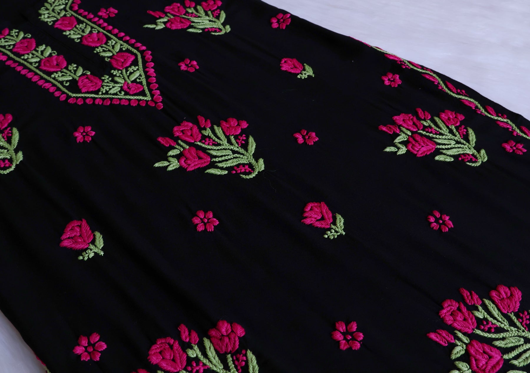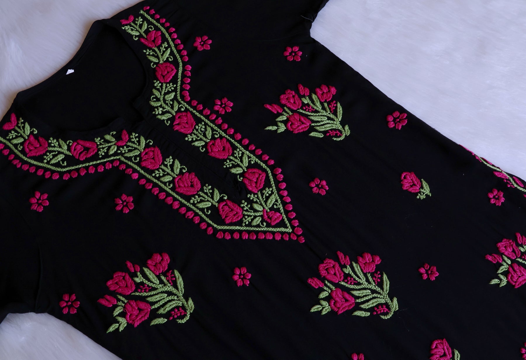 Black Long Rayon KUrfa with chikankari handwork in Paisley and Floral pattern.