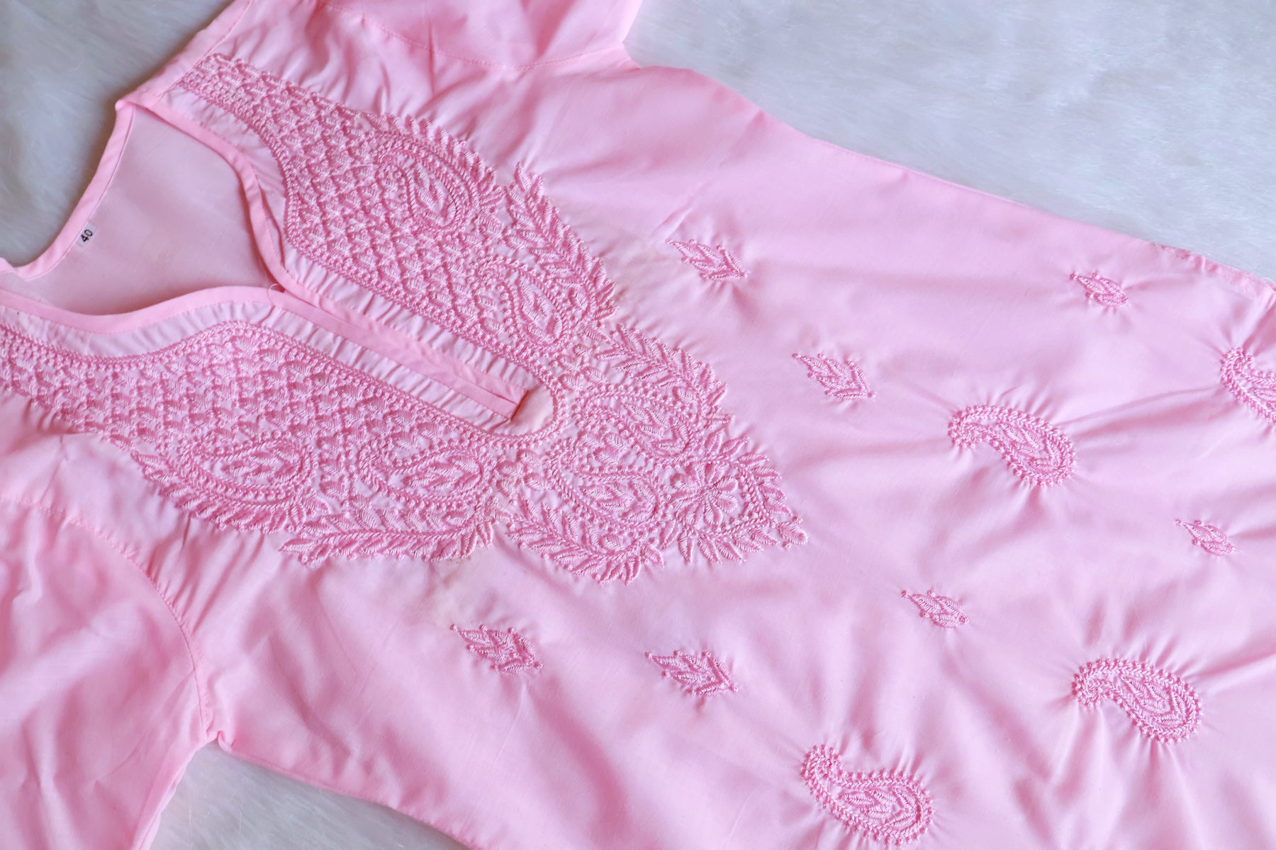 Baby Pink Long cotton kurta with self toned embroidery in Leat & Paisley pattern in the delicate design.