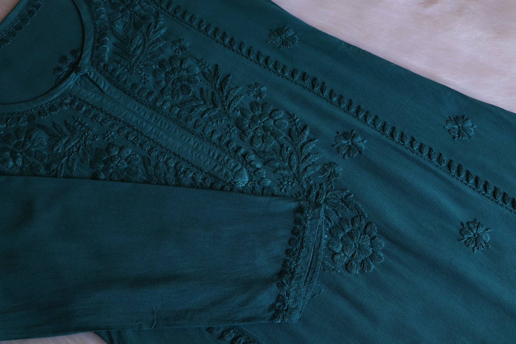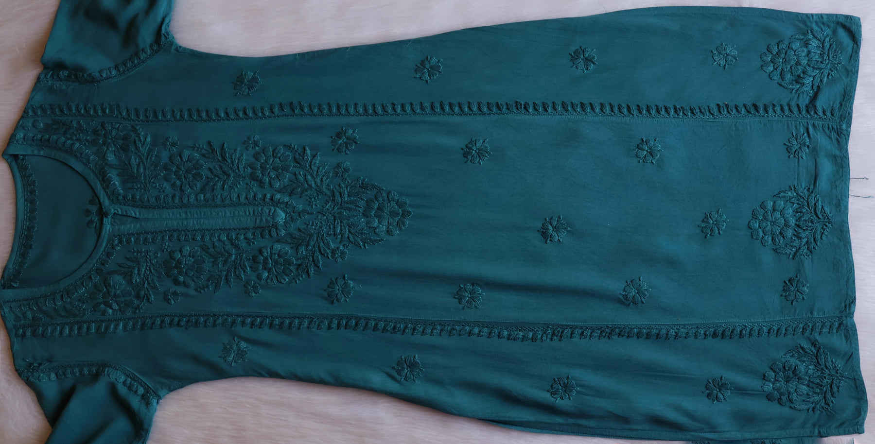 There can be slight variation in embroidery as every single piece is handmade. There may be 10-15% difference in colour as the screen/display settings of every phone differs.