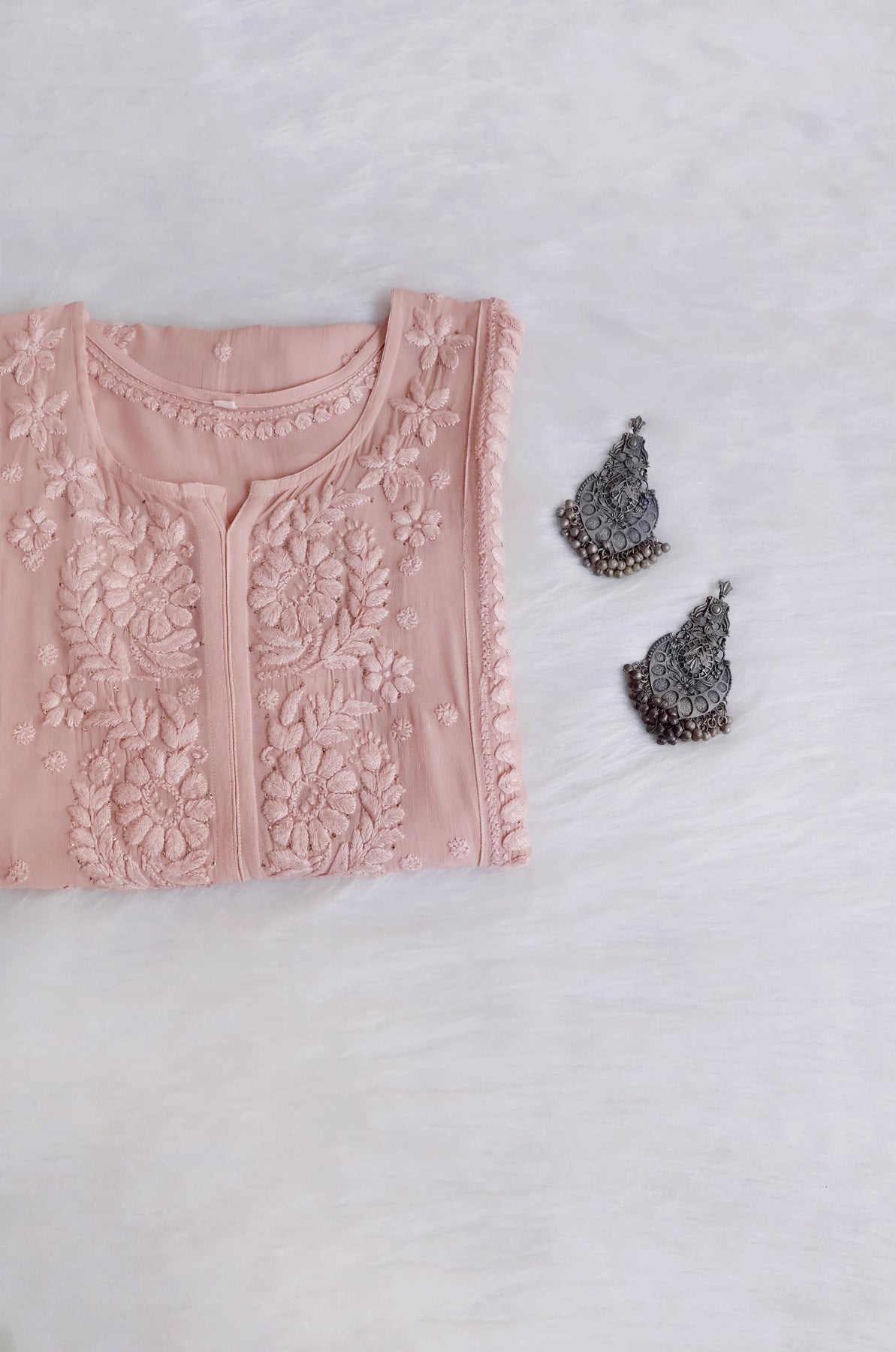 Rose Beige long pure Viscose Georgette kurta with chikankari handwork in Leaf and Floral intricate pattern with Mukaish embellishments on the kurta.