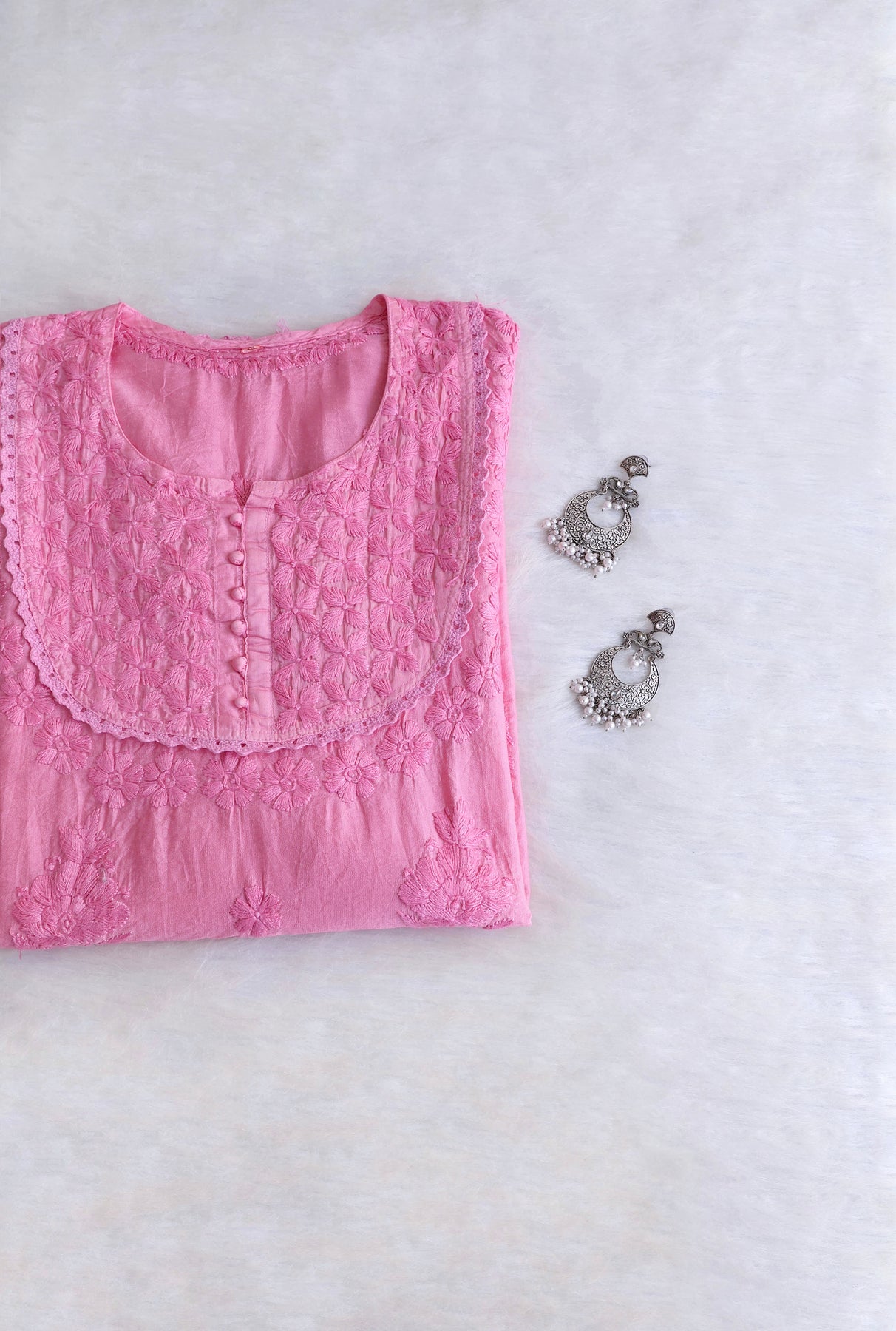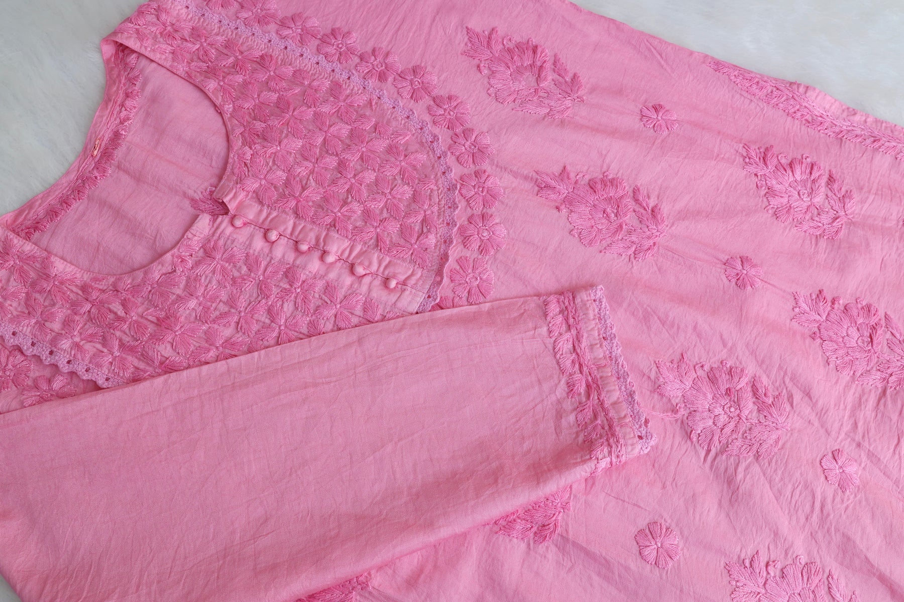 Baby Pink short Chanderi top with chikankari handwork in Paisley and Floral pattern. It's a really Stylish top with beautiful details and comfort!