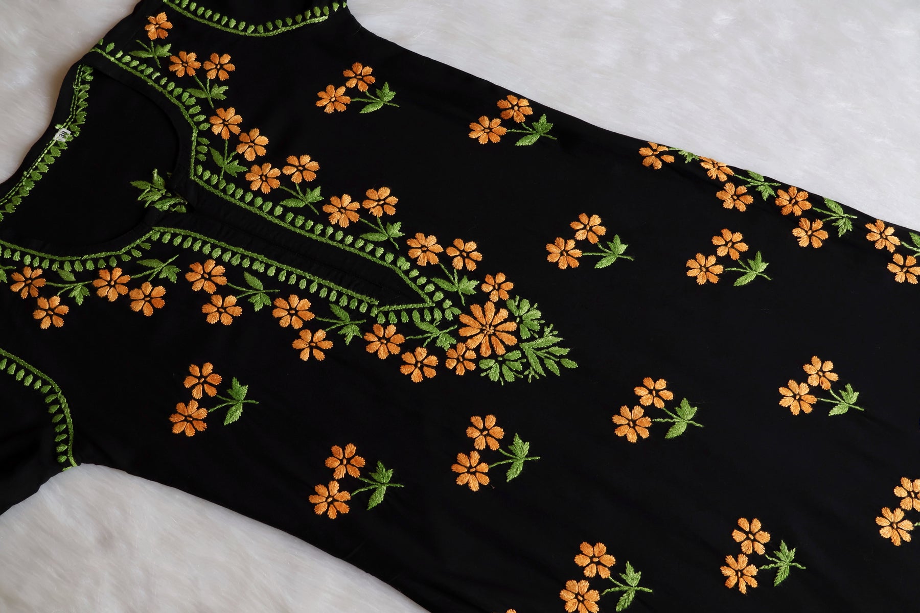 Black Long rayon kurta with chikankari handwork in Rose and Floral pattern with Multicolored ombre thread paired with a matching Rayon palazzo. It's the perfect kurta set for winter with beautiful Floral details and comfort!
