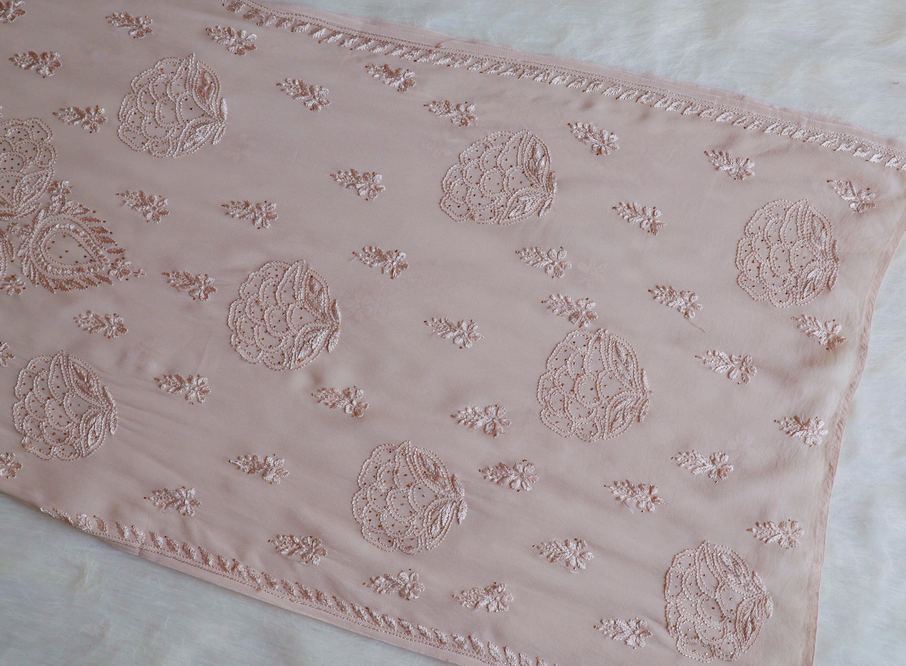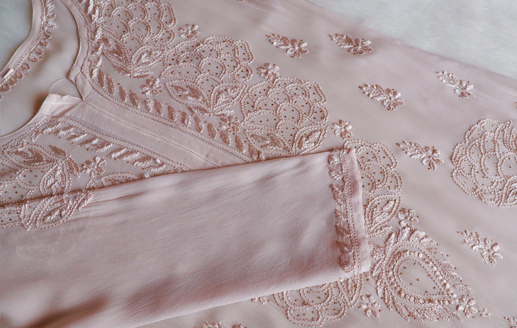 Beige long pure Viscose Georgette kurta with chikankari handwork in Leaf and Floral intricate pattern with Mukaish embellishments on the kurta.