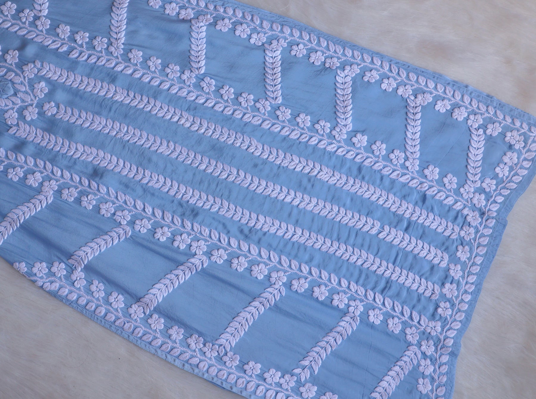 Ice Blue long pure Crepe Silk kurta with chikankari handwork in Leaf and Floral intricate pattern on the kurta.