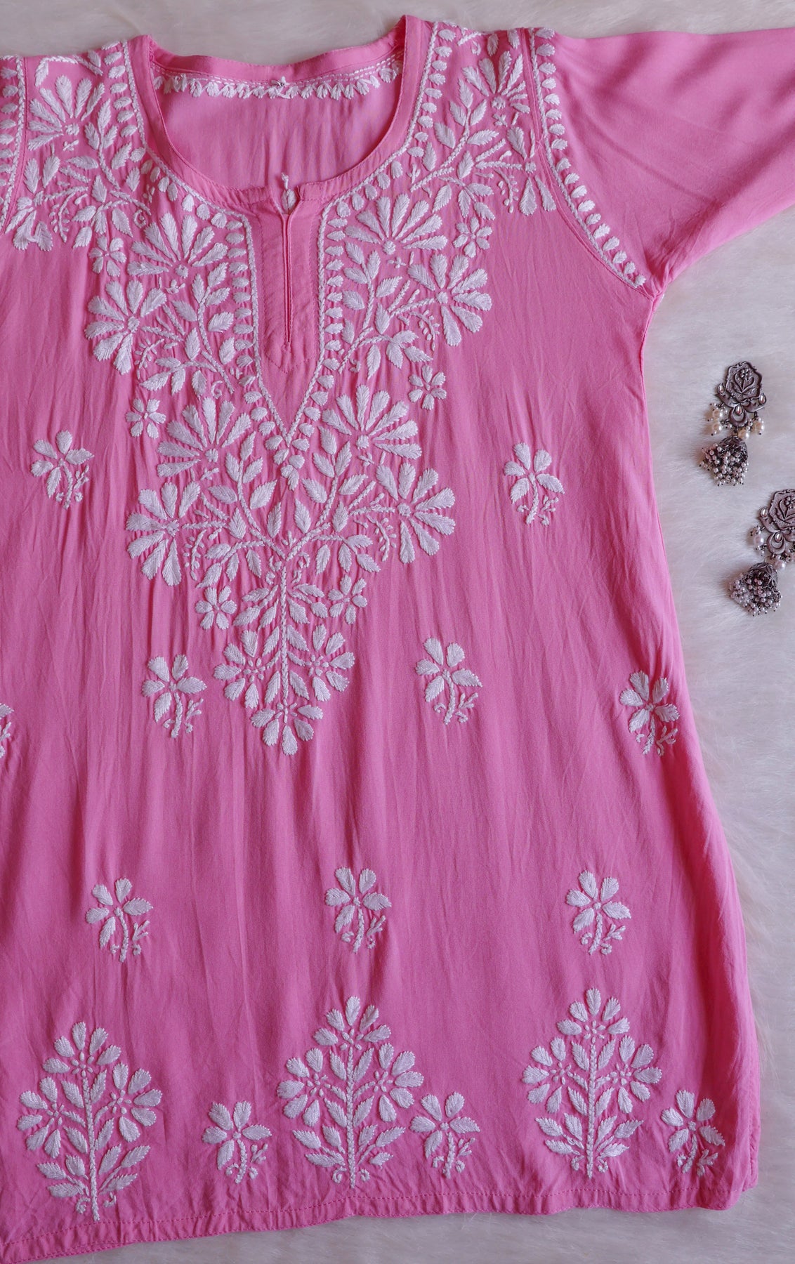 Baby Pink Short Rayon top with chikankari handwork in Paisley and Floral pattern. It's a really Stylish top with beautiful details and comfort!