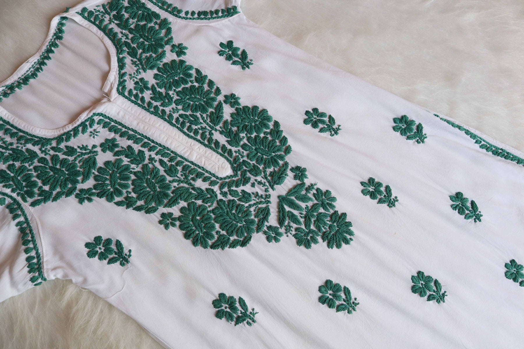 White Long Rayon kurta with chikankari handwork in Paisley pattern with Intricate details. You need a Soft Rayon kurta in all the seasons. They're the most versatile piece of clothing you can own.