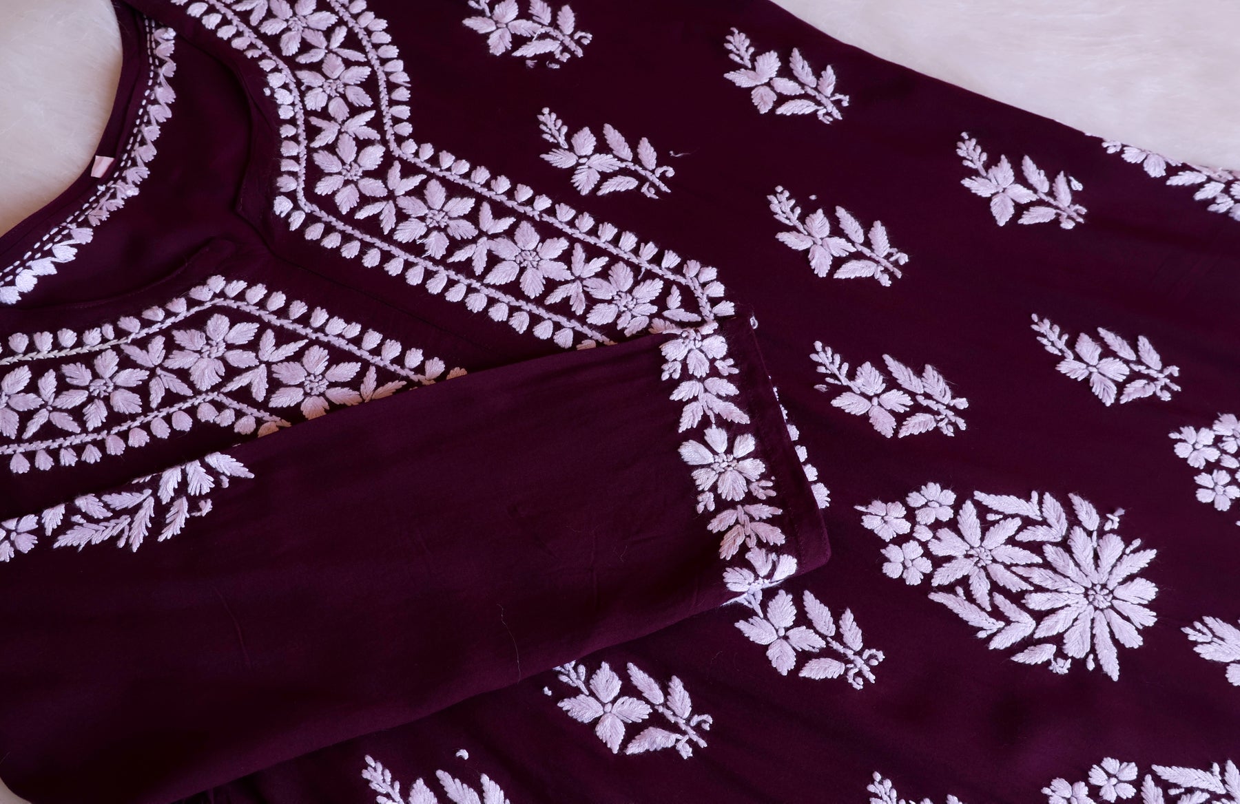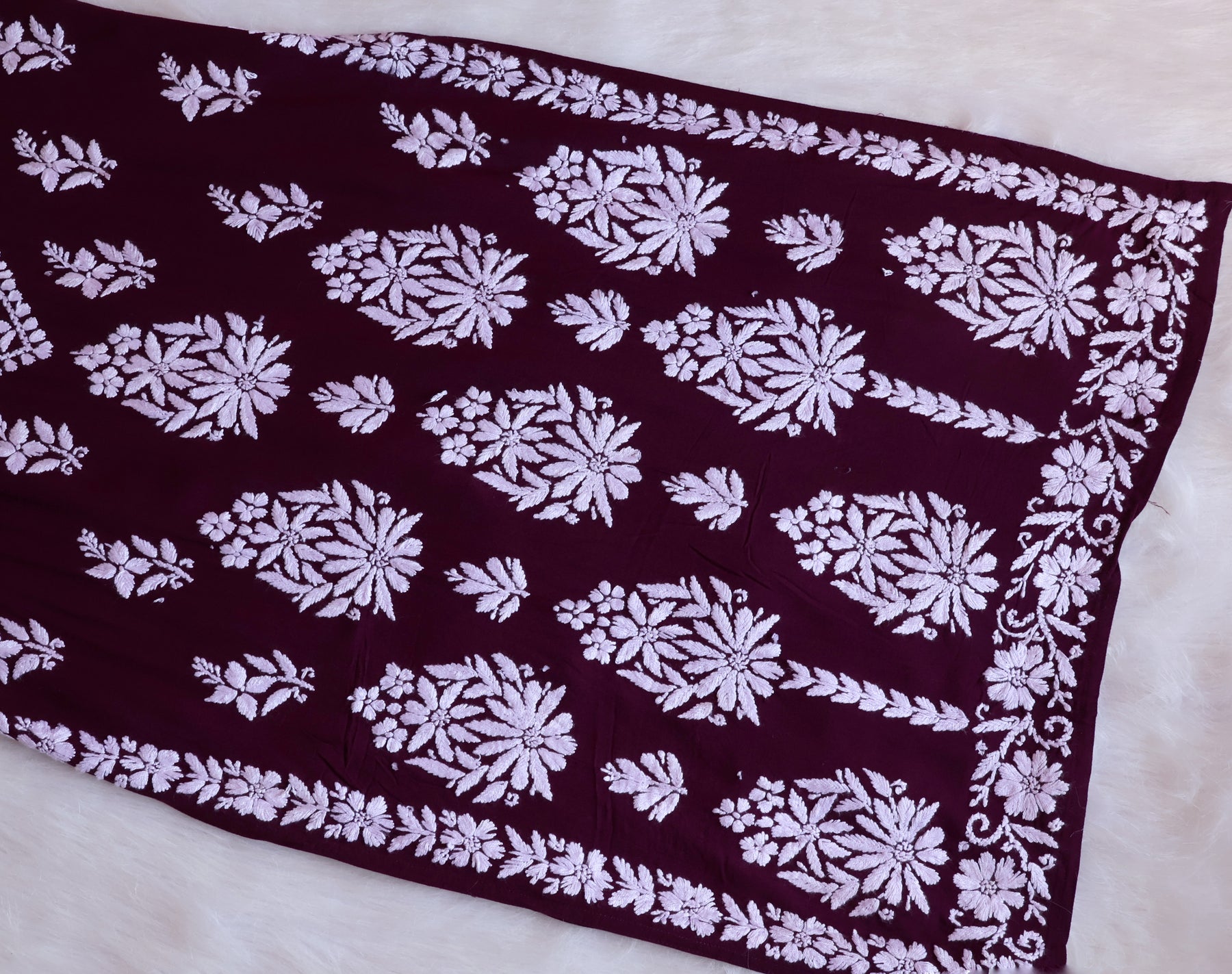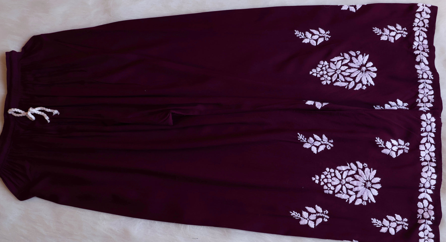 Deep Purple Long rayon kurta with White chikankari in Floral pattern paired with a matching palazzo to complete the look.