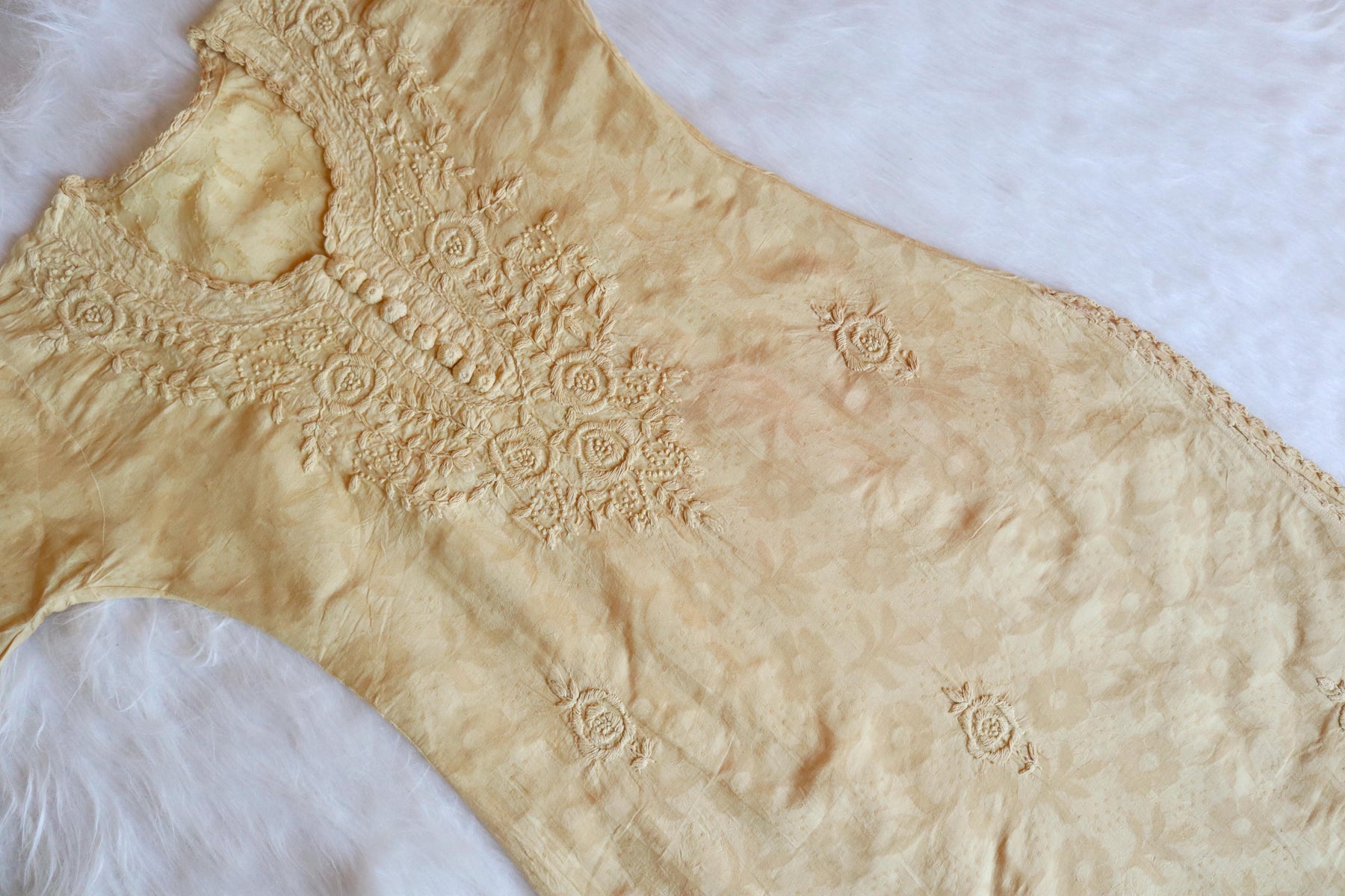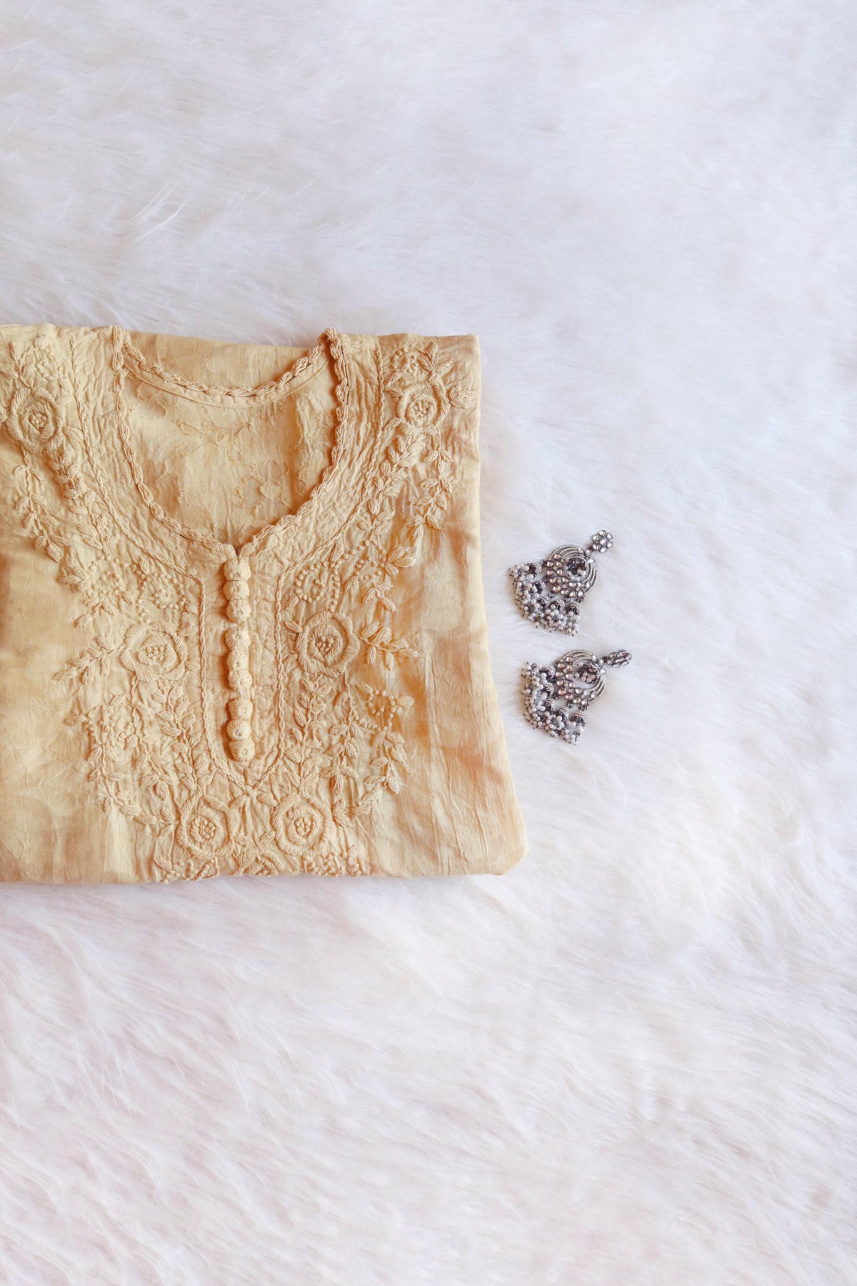 Beige Cotton Jacquard kurta with chikankari handwork in Paisley and Floral pattern with beautiful crotia buttons in the front to elevate the look.