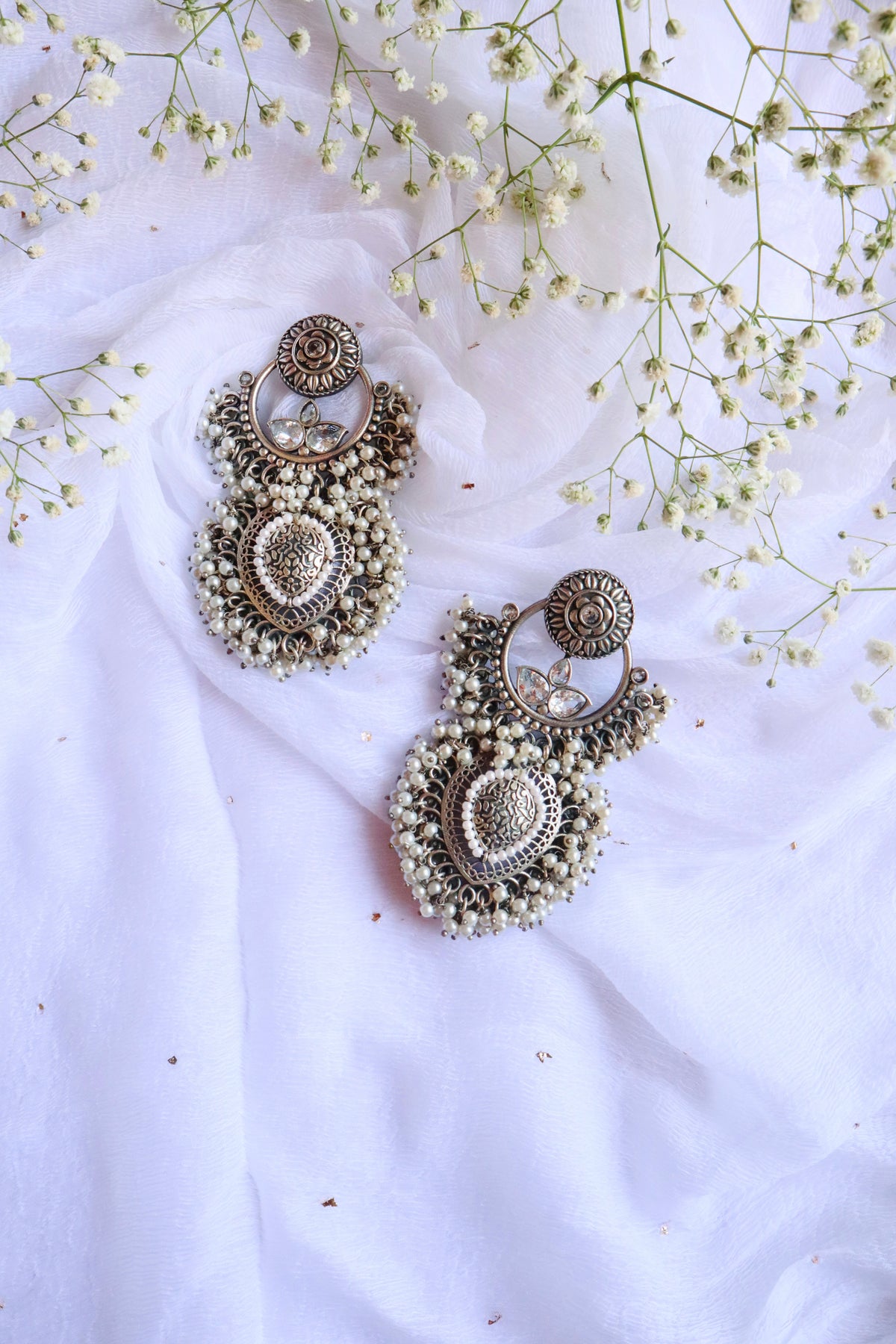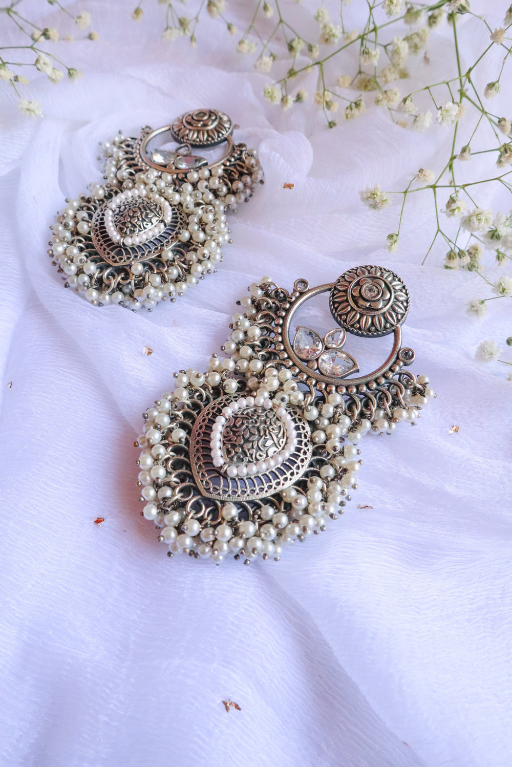 Silver plated oxidised Chandelier earrings in Teardrop shape with artificial sliver & pearls detail.