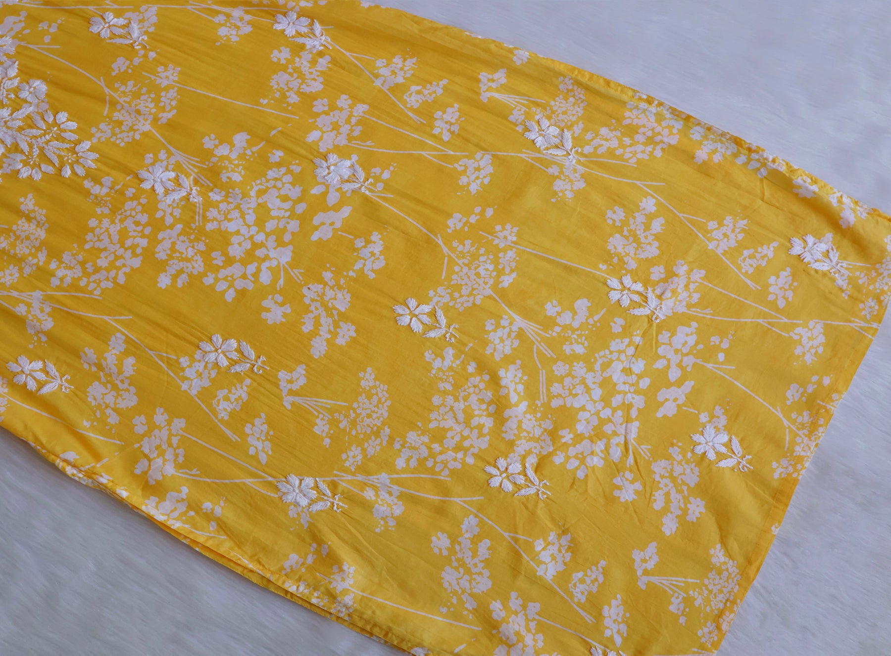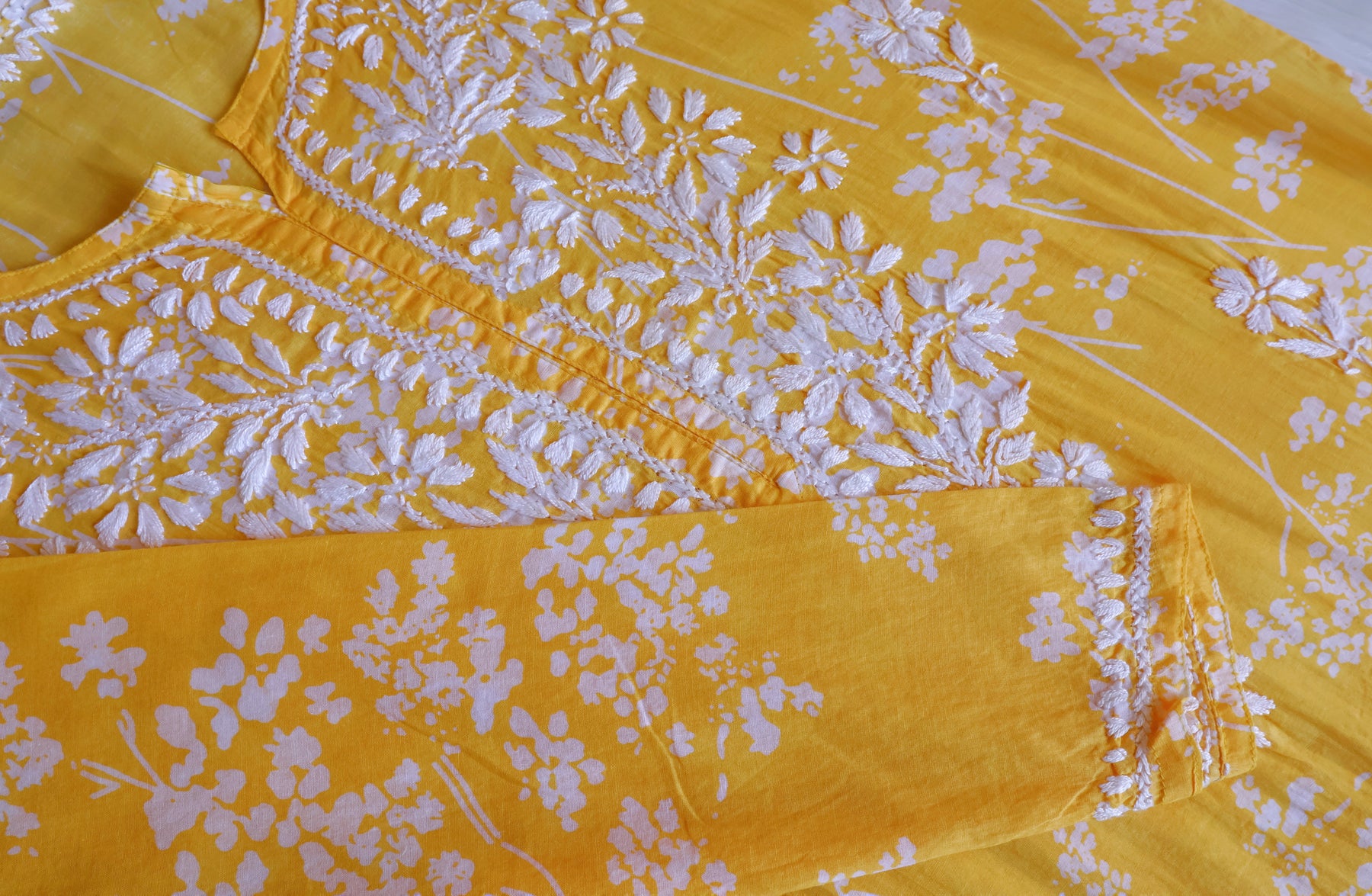 Yellow Long Mulmul kurta with White chikankari in Floral & Leaf print all over.