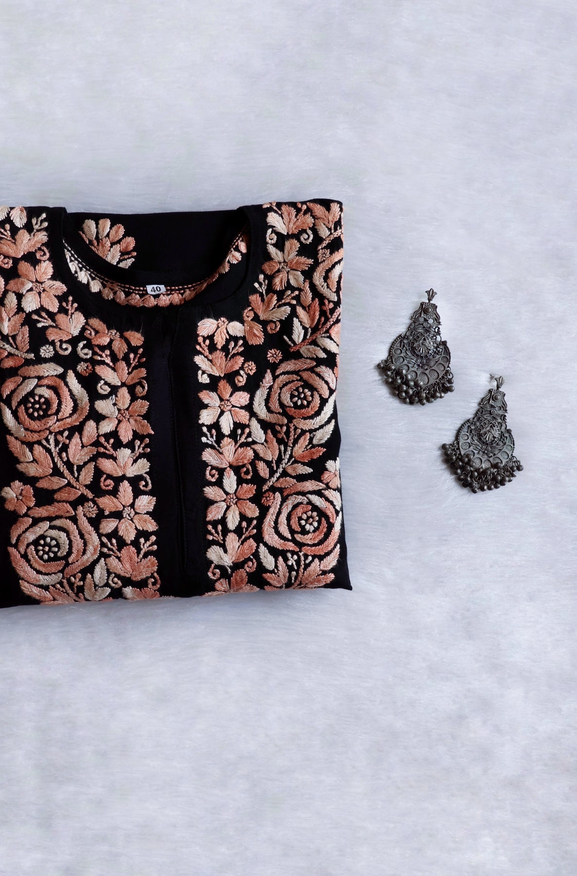 Black Ombre Long Rayon top with chikankari handwork in Paisley and Floral pattern. It's a really Stylish top with beautiful details and comfort!