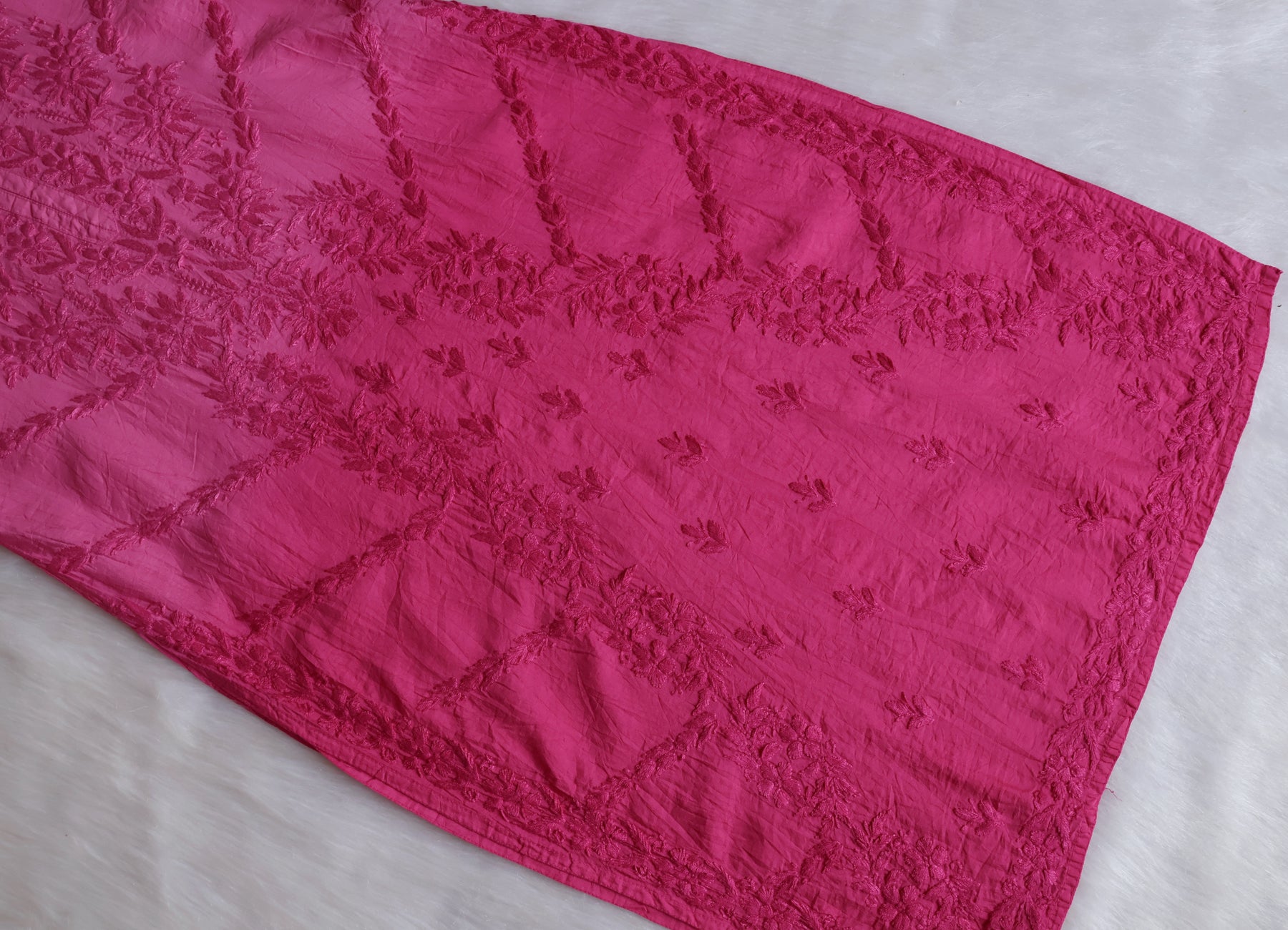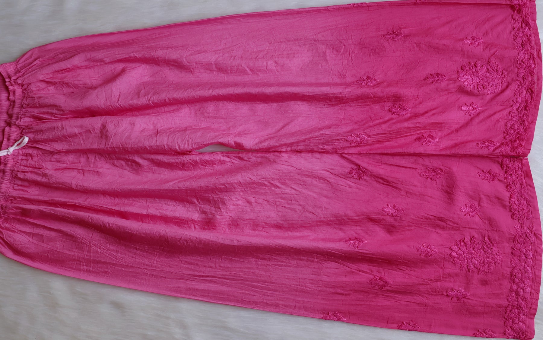 Baby Pink Long Chanderi kurta with Self toned chikankari in Floral pattern paired with a matching palazzo to complete the look.