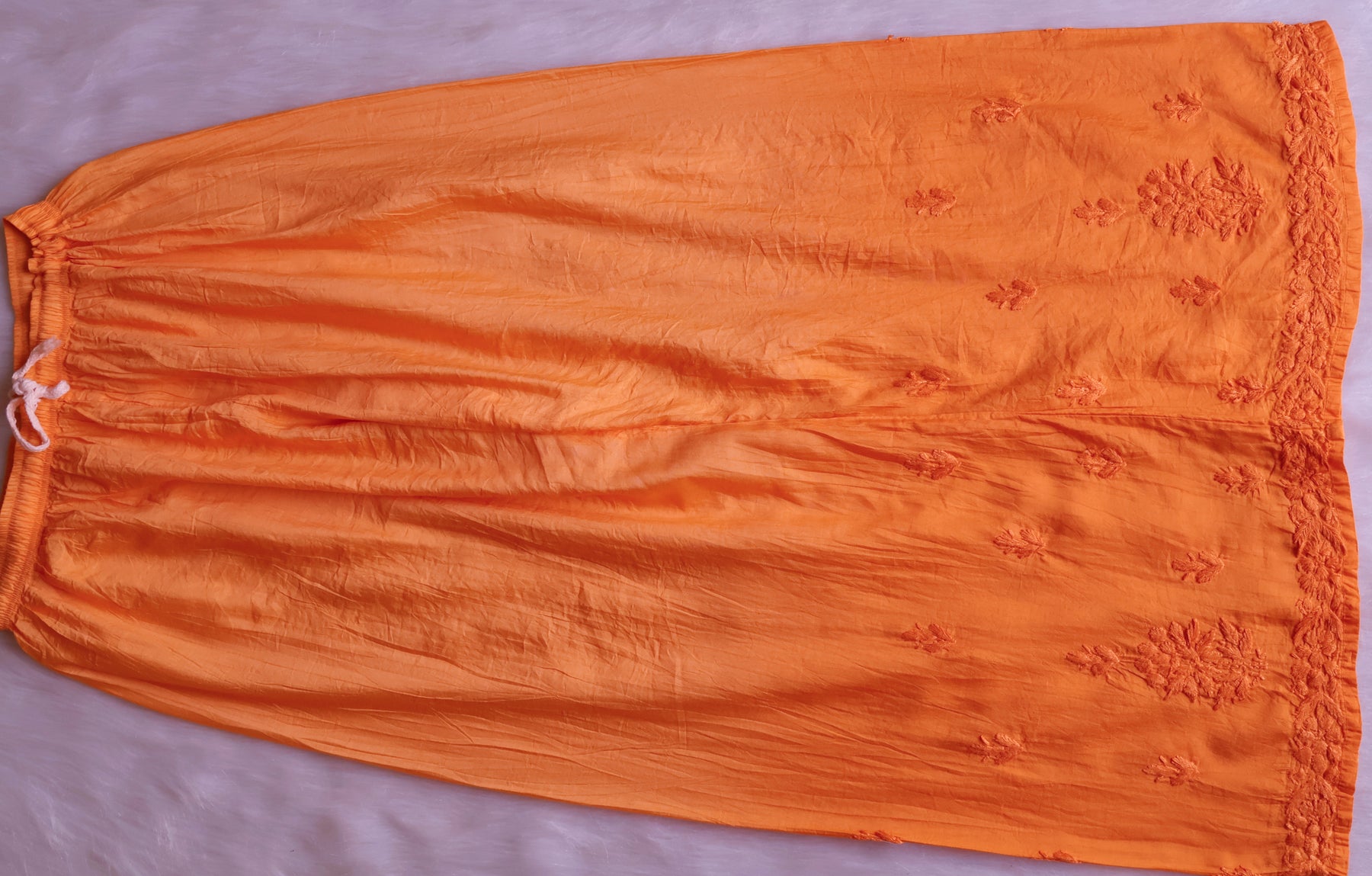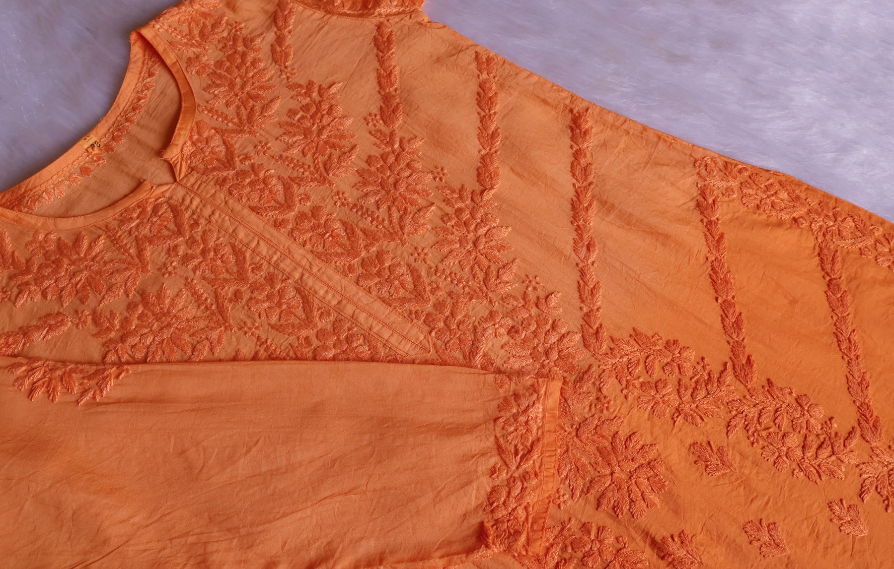 Peach Long Chanderi kurta with Self toned chikankari in Floral pattern paired with a matching palazzo to complete the look.