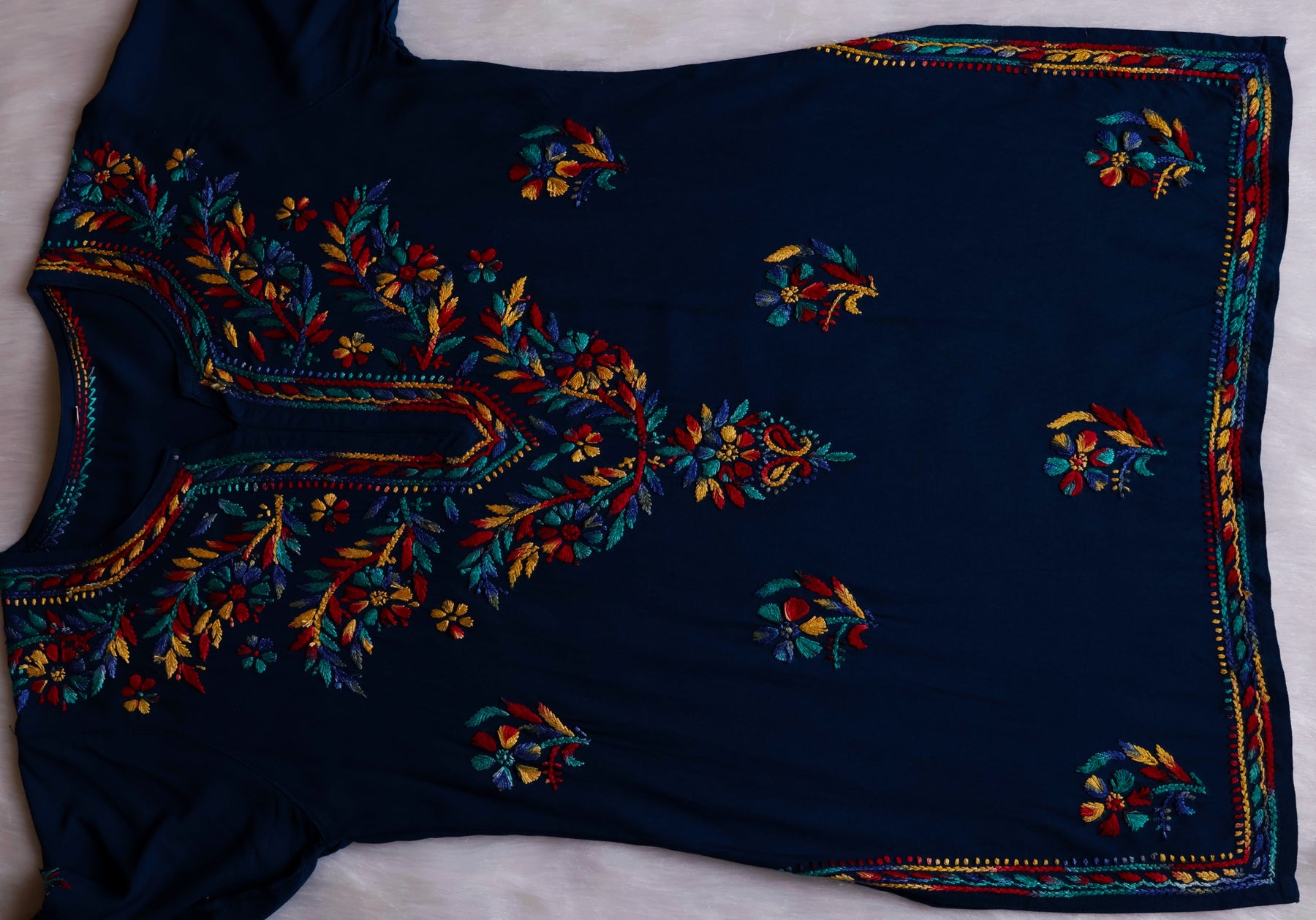 Navy Blue short Rayon top with chikankari handwork in Paisley and Floral pattern. It's a really Stylish top with beautiful details and comfort!