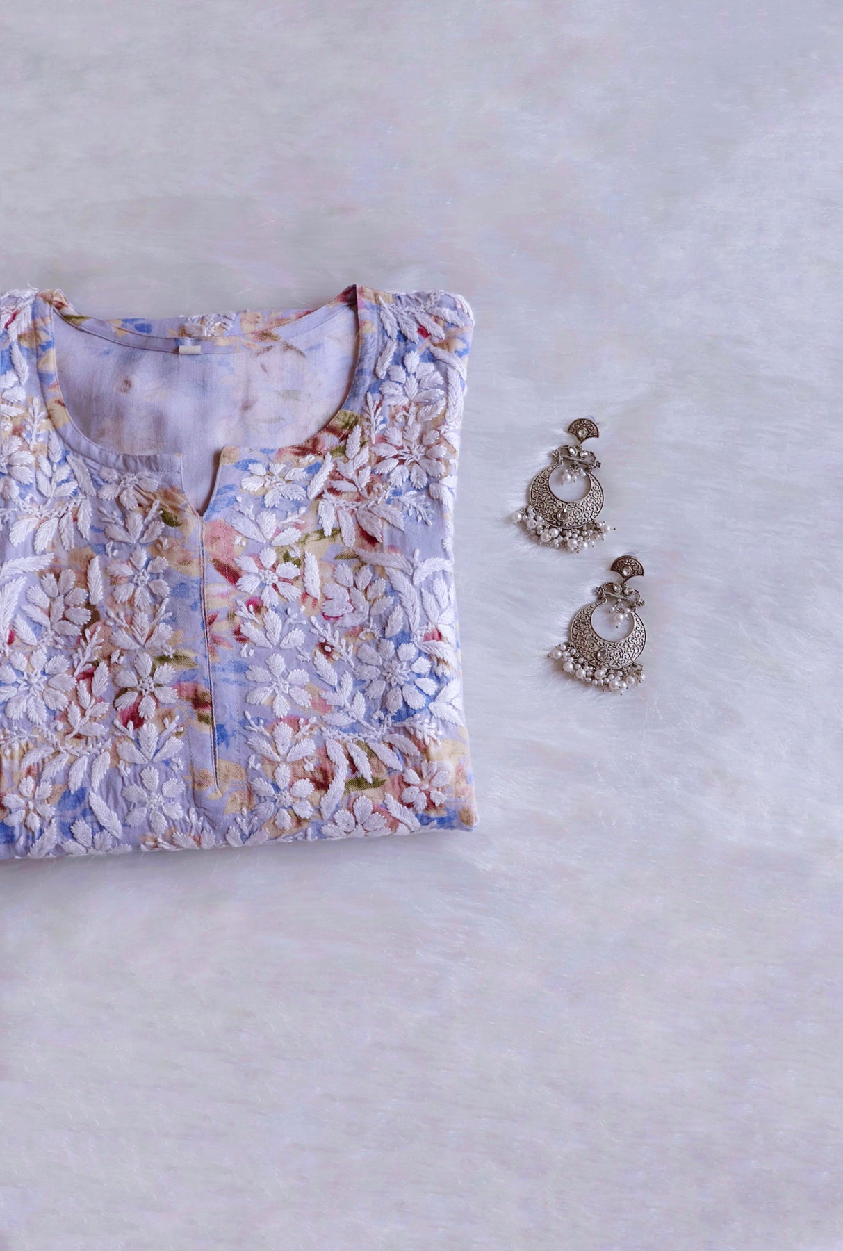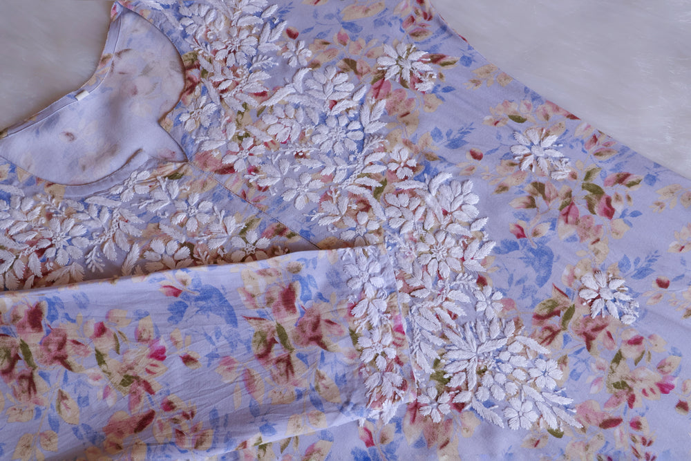 Lavender long kurta with Chikankari handwork in Paisley and Rose pattern in the front on a beautifully printed Modal flowy fabric.
