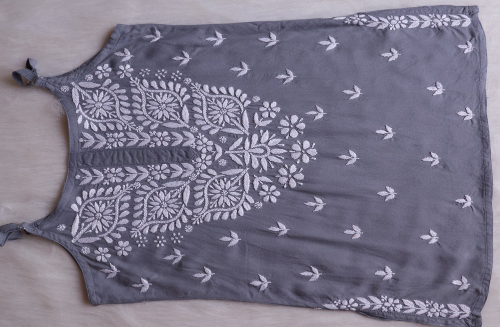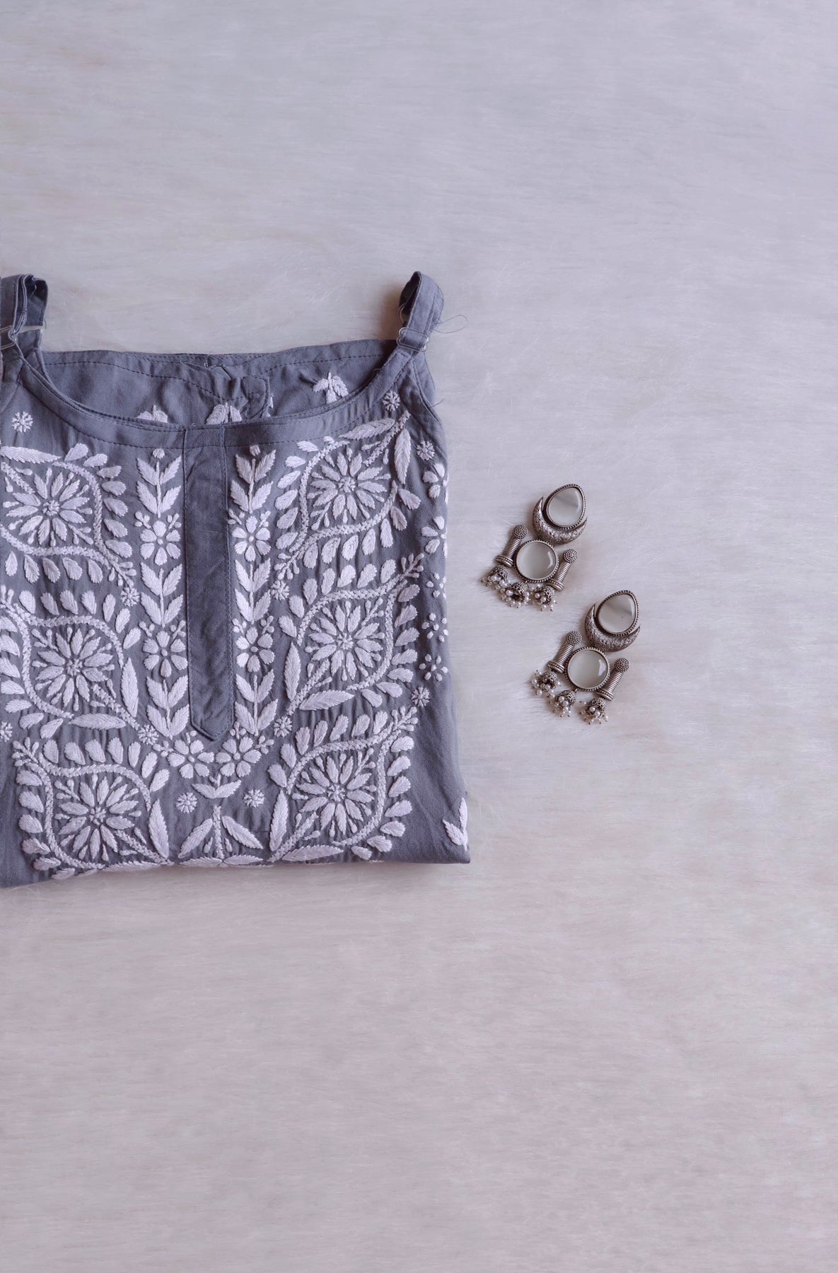 Grey long Soft Rayon kurta with chikankari handwork in Leaf and Floral intricate pattern with Strappy shoulders.
