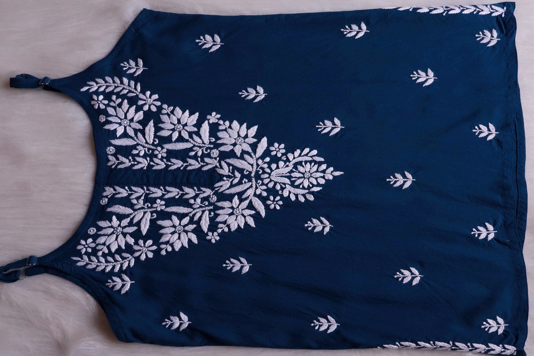 Midnight Blue Soft Rayon kurta with chikankari handwork in Leaf and Floral intricate pattern with Strappy shoulders.