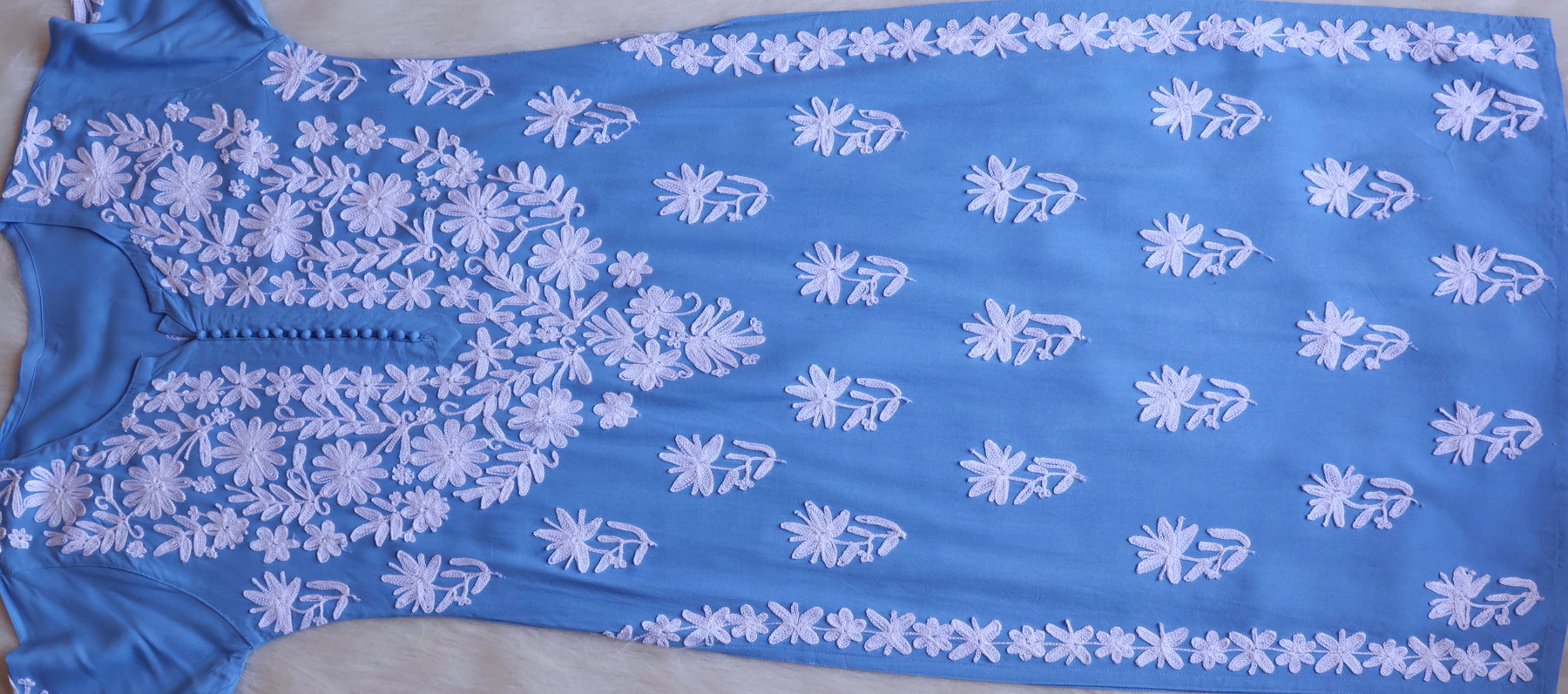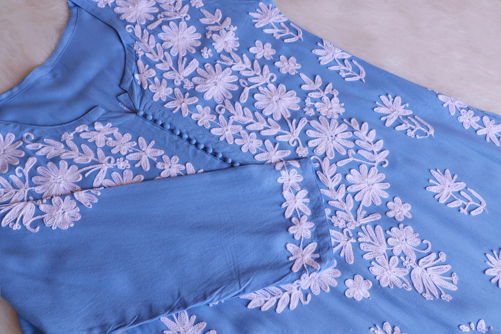 Ice Blue Long rayon kurta with White Aari work in Floral pattern paired with a matching palazzo to complete the look.