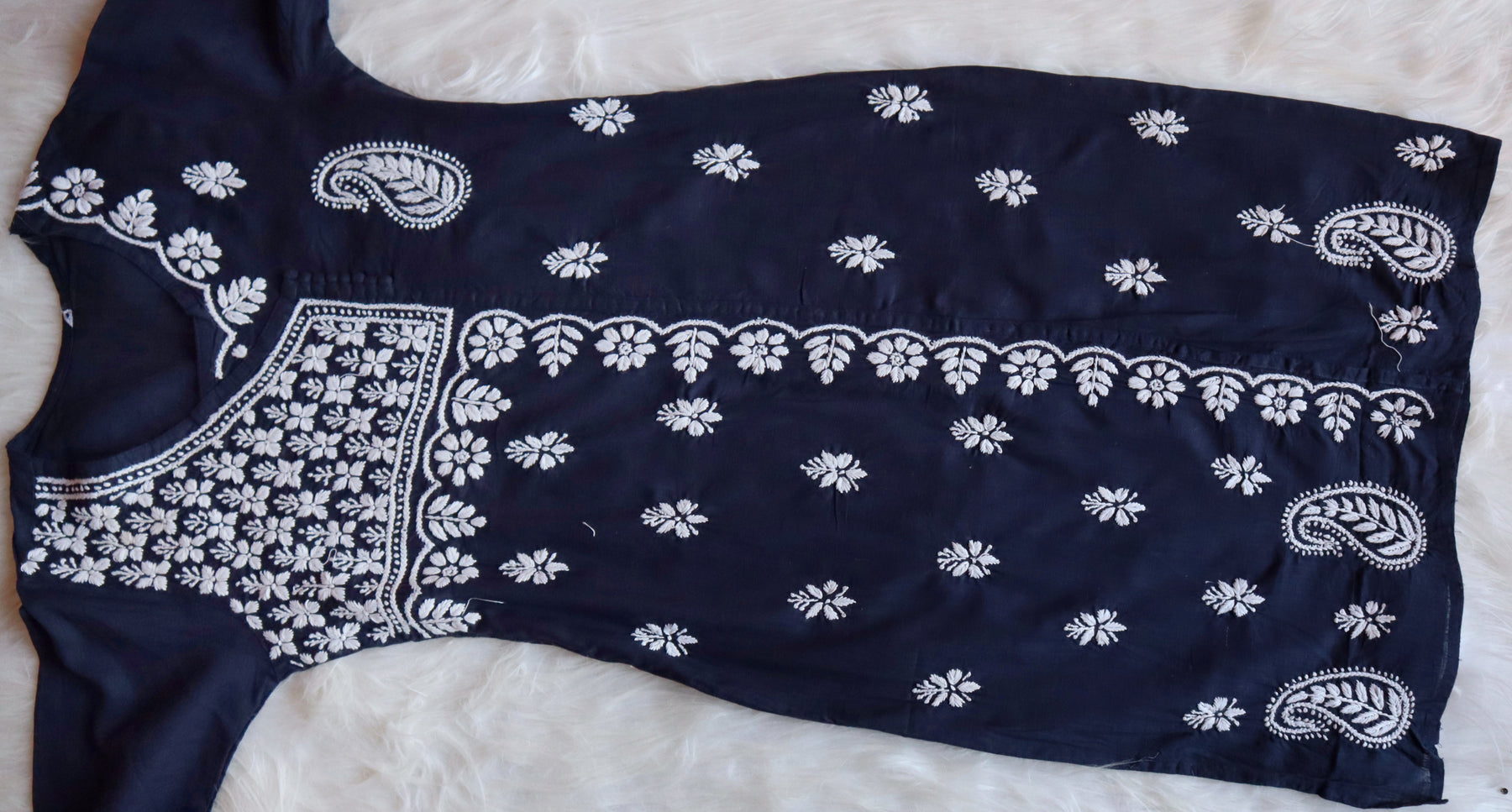 Navy Blue Long cotton kurta with White chikankari in Floral & Leaf pattern in Angarakha style with Potli buttons on the side.