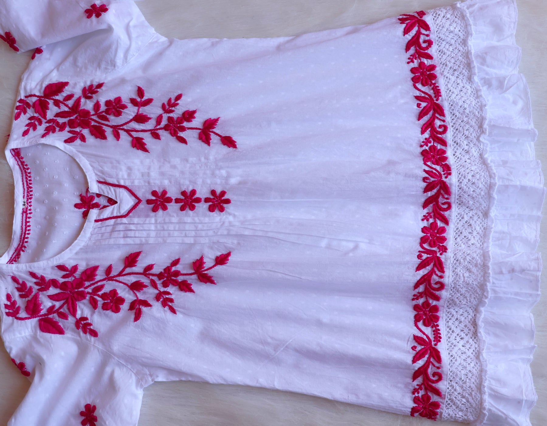 White short cotton top with chikankari handwork in Paisley and Floral pattern.
