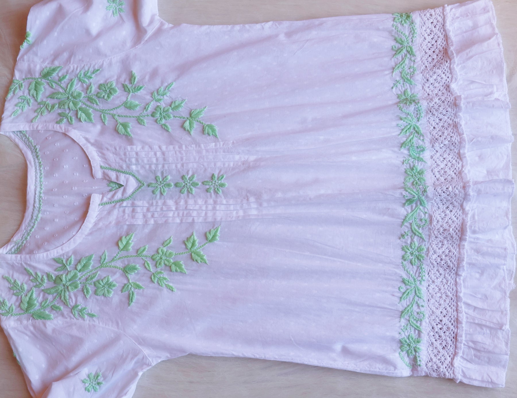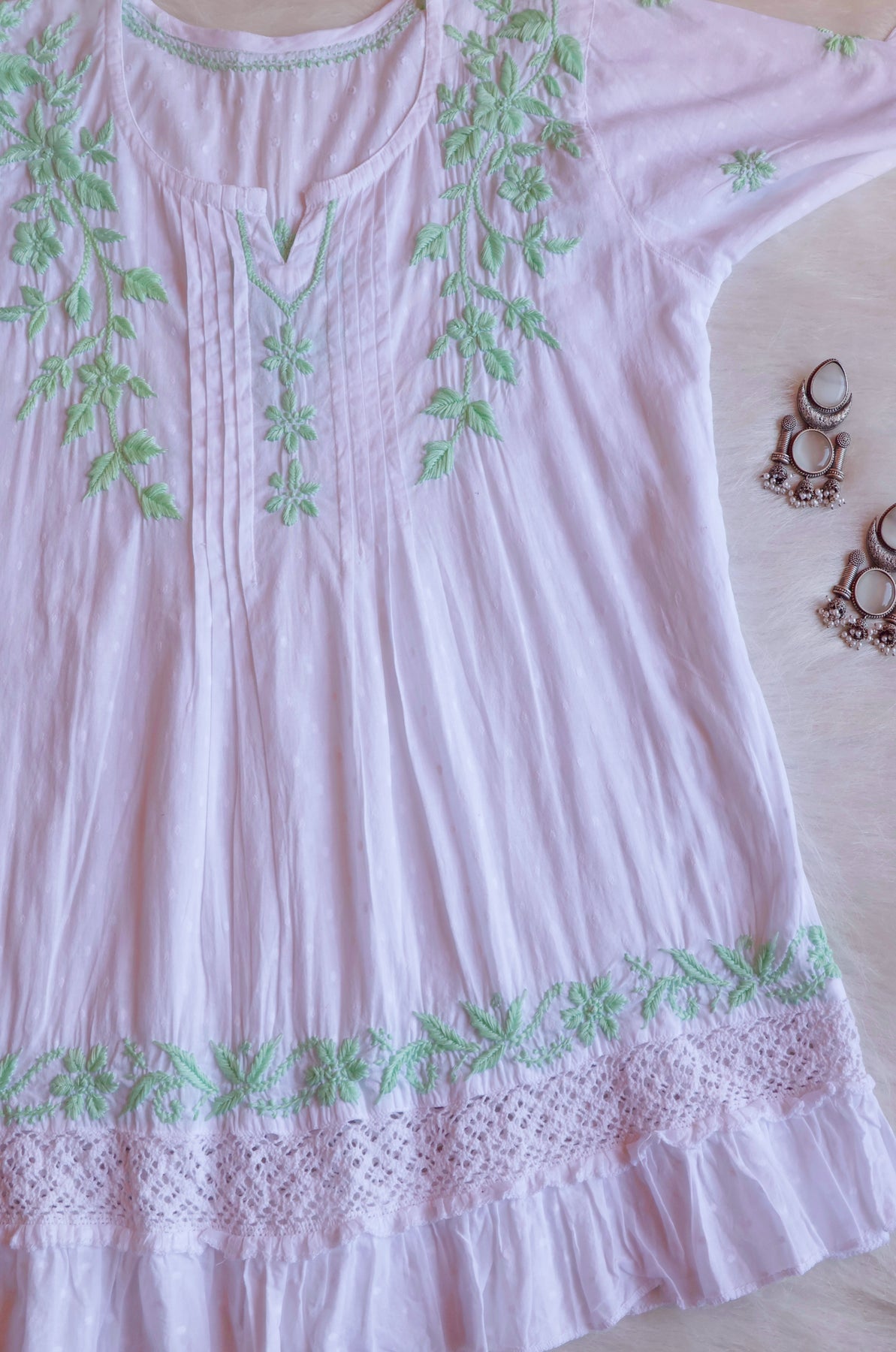 White short cotton top with chikankari handwork in Paisley and Floral pattern.