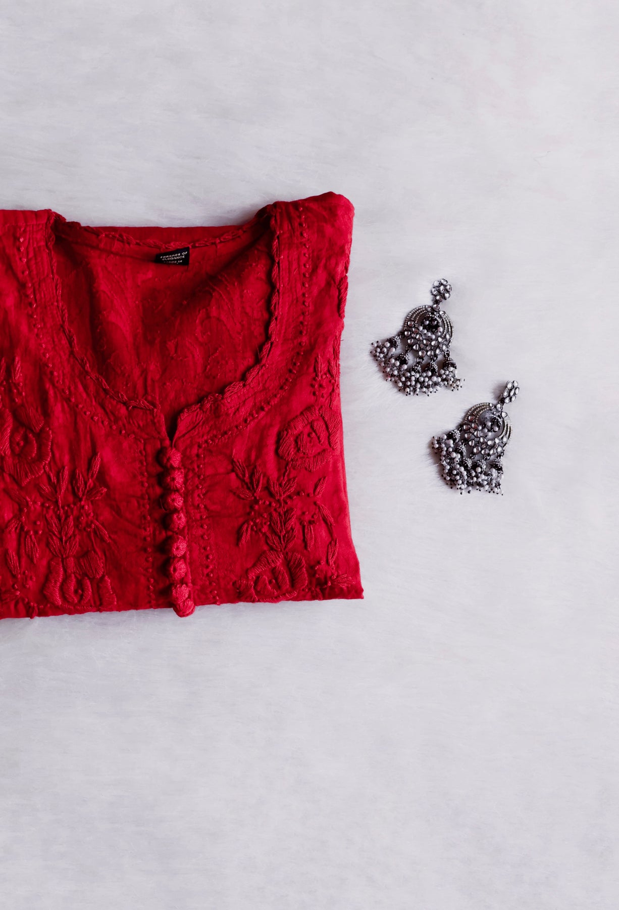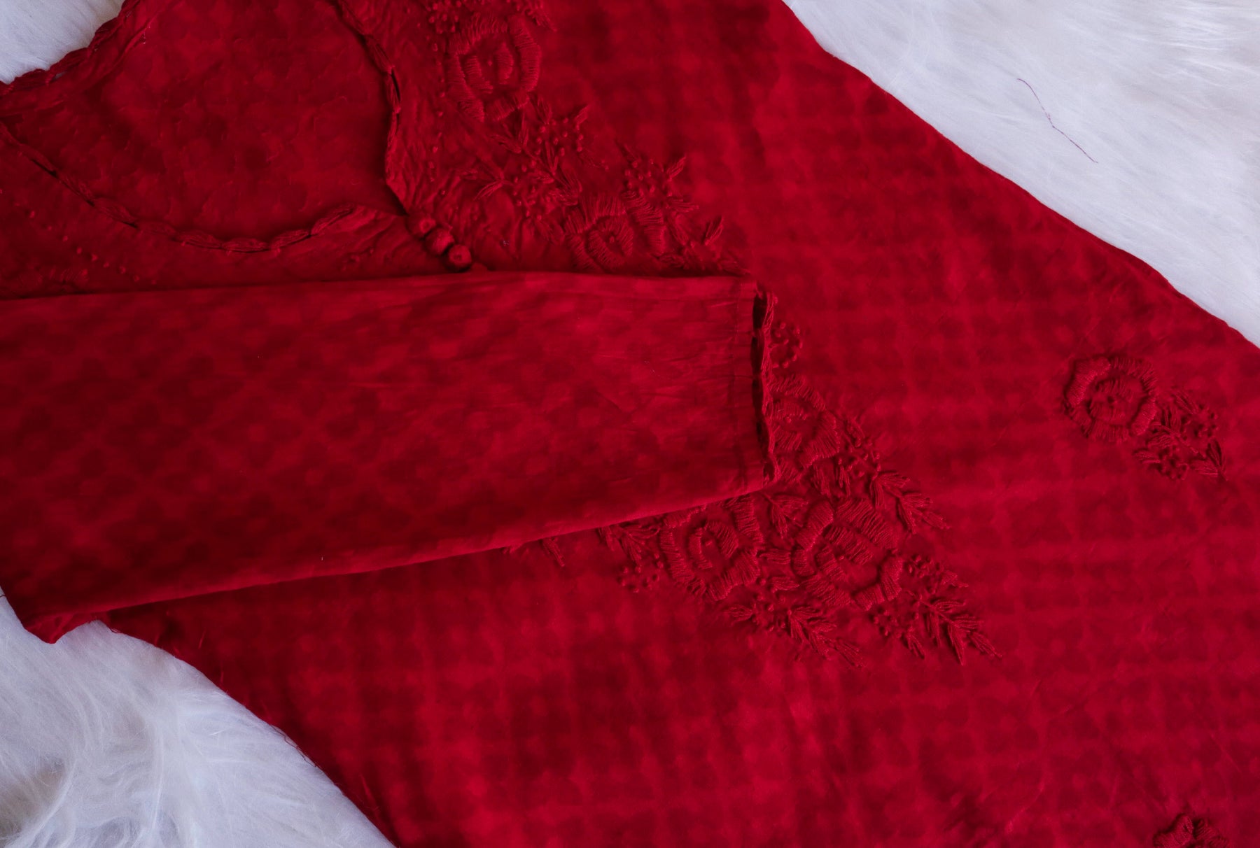 Red Cotton Jacquard kurta with chikankari handwork in Paisley and Floral pattern with beautiful crotia buttons in the front to elevate the look.